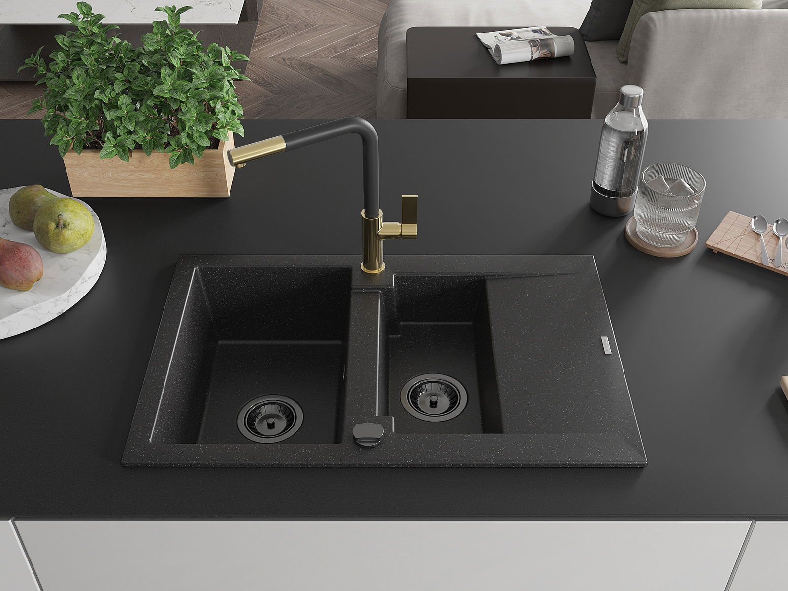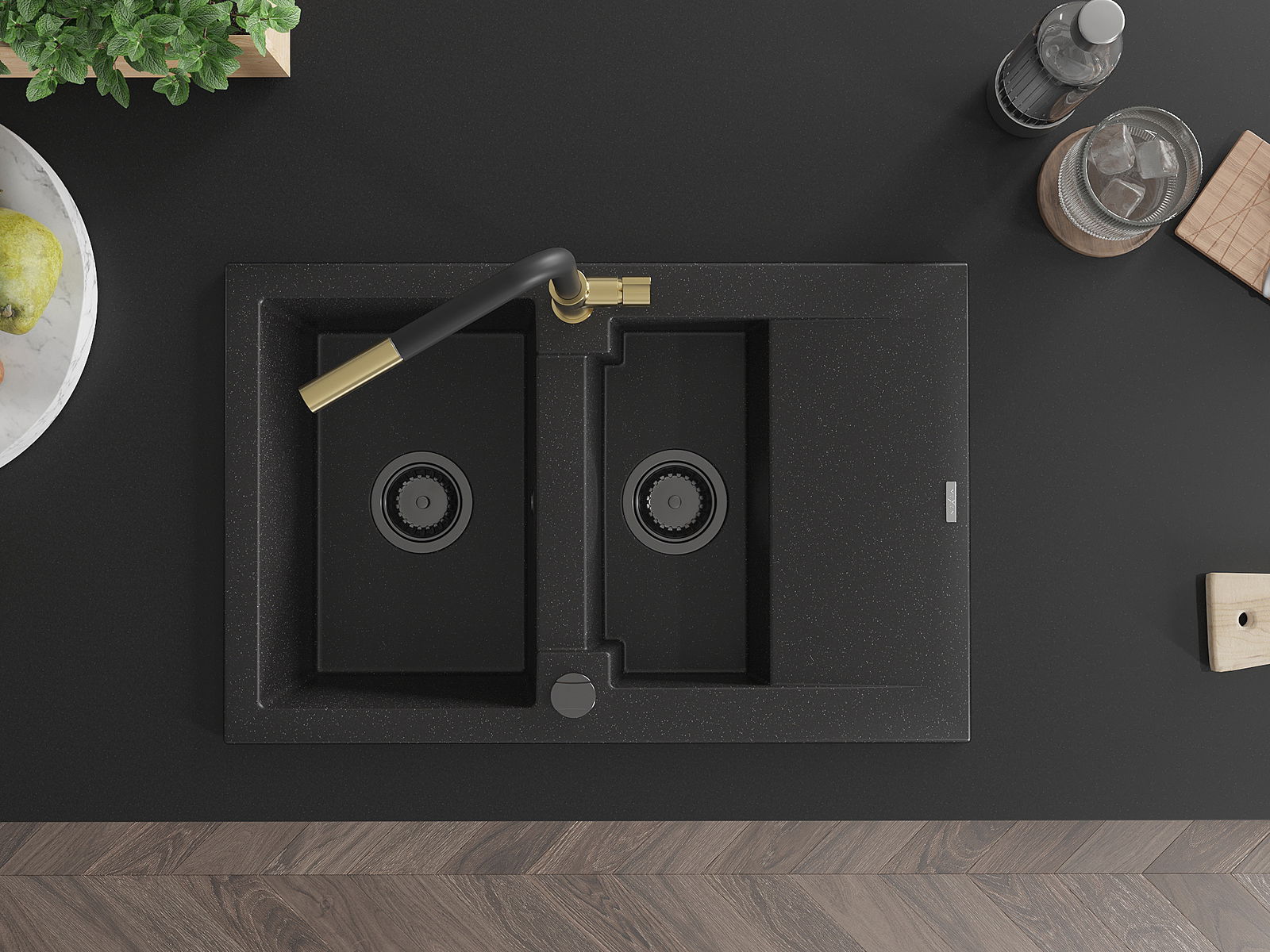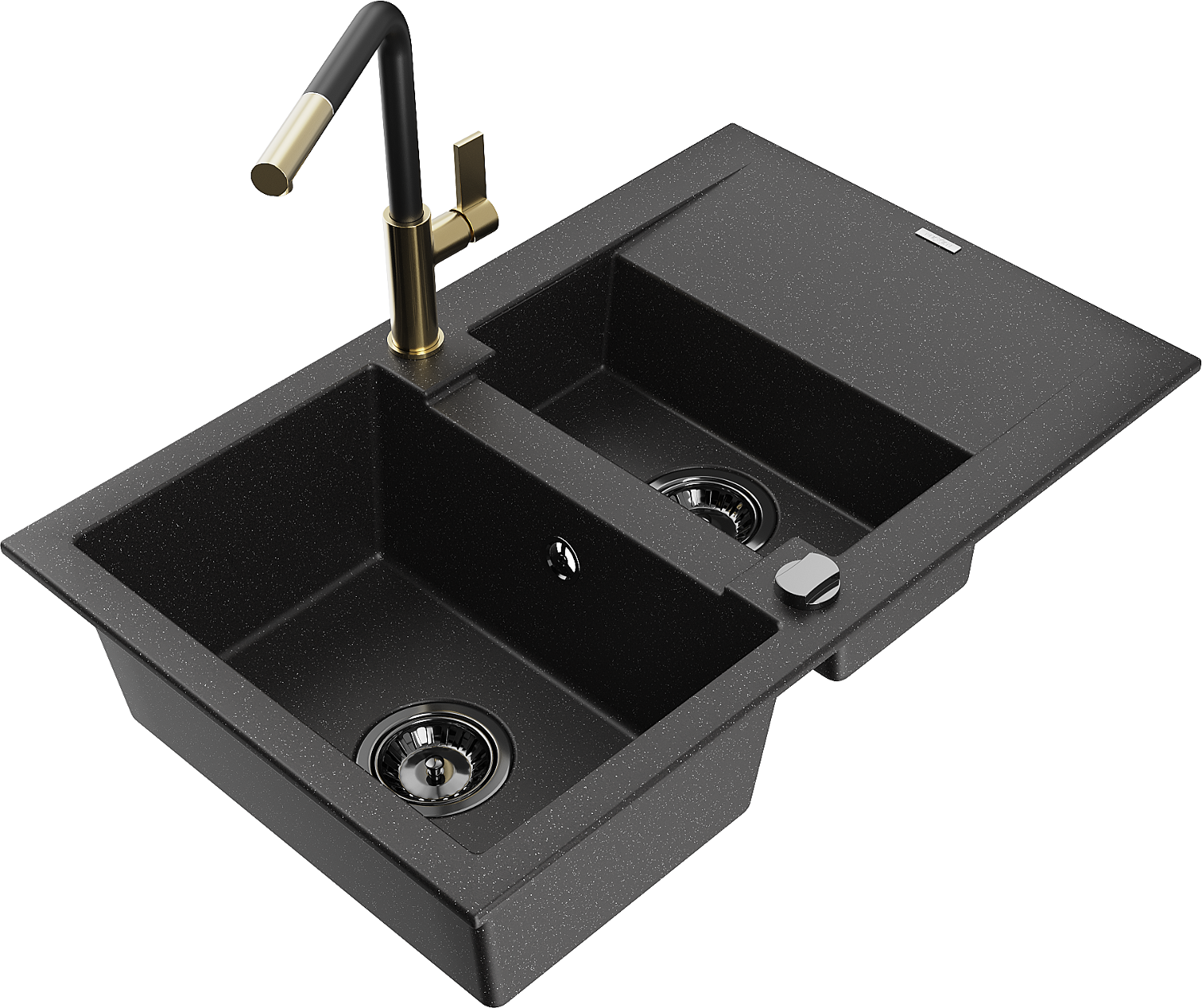 Mexen Gaspar žulový dřez 1,5-komorový s odkapávačem a kuchyňskou baterií Flora, černý/stříbrný - 6507-73-670401-57-B