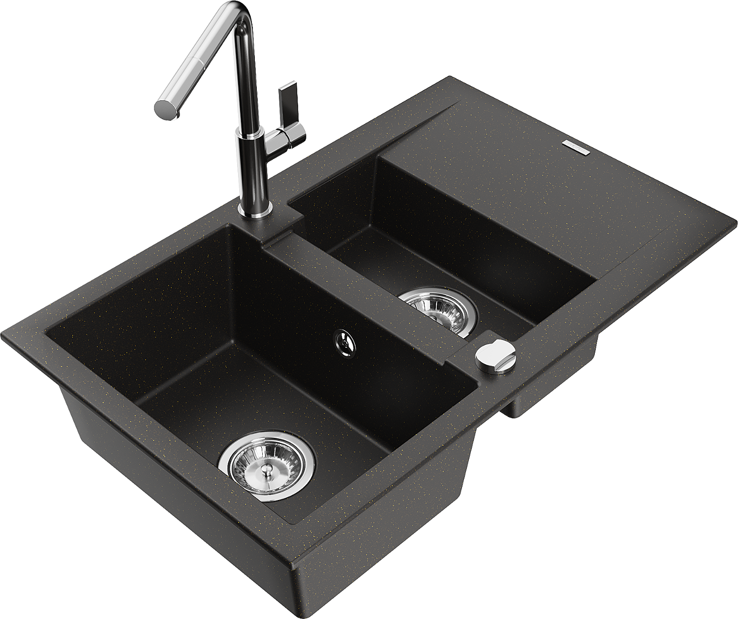 Mexen Gaspar žulový dřez 1,5-komorový s odkapávačem a kuchyňskou baterií Flora, černý/zlatý metalik - 6507-75-670401-00