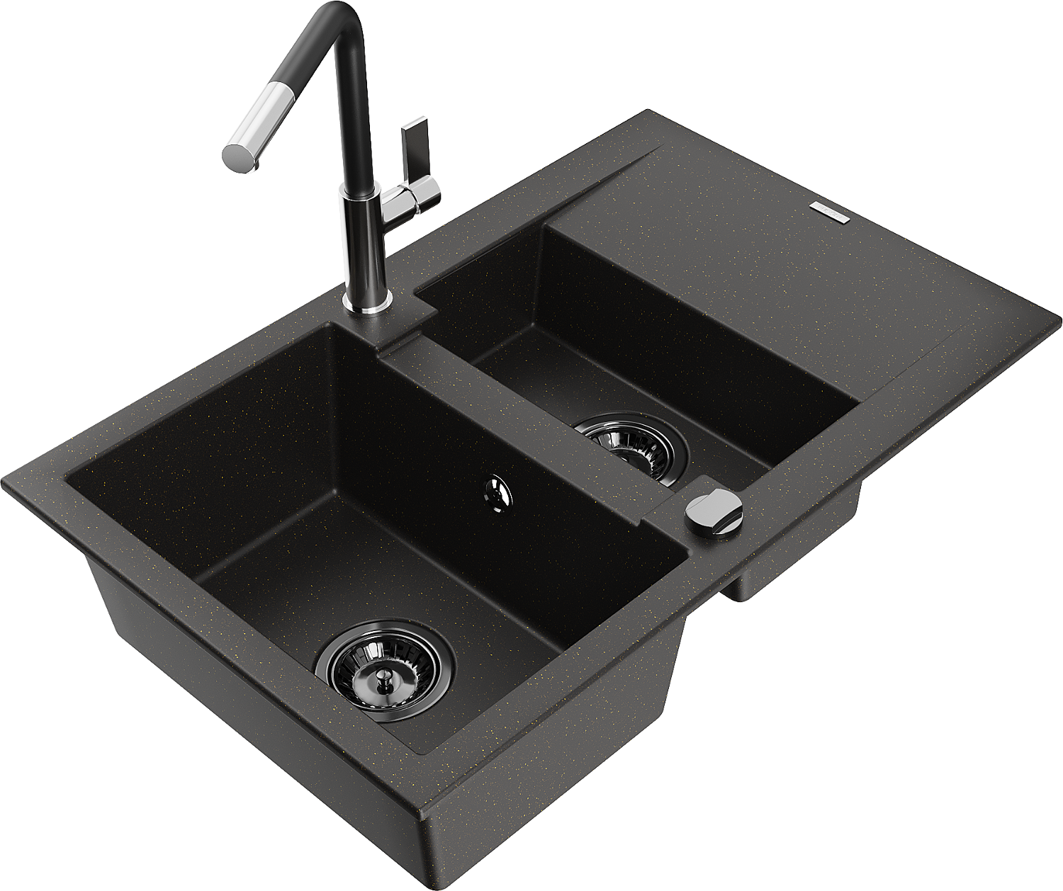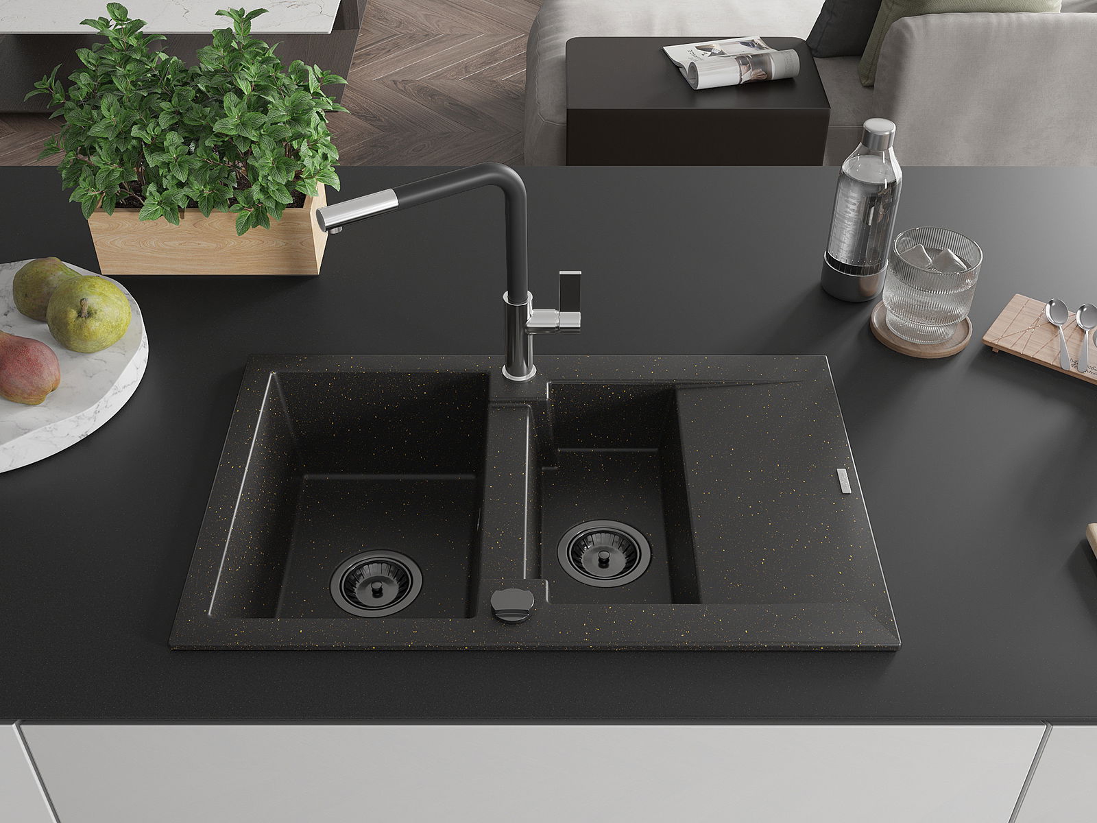 Mexen Gaspar granitový dřez 1,5-komorový s odkapávačem a kuchyňskou baterií Flora, černý/zlatý - 6507-75-670401-07-B