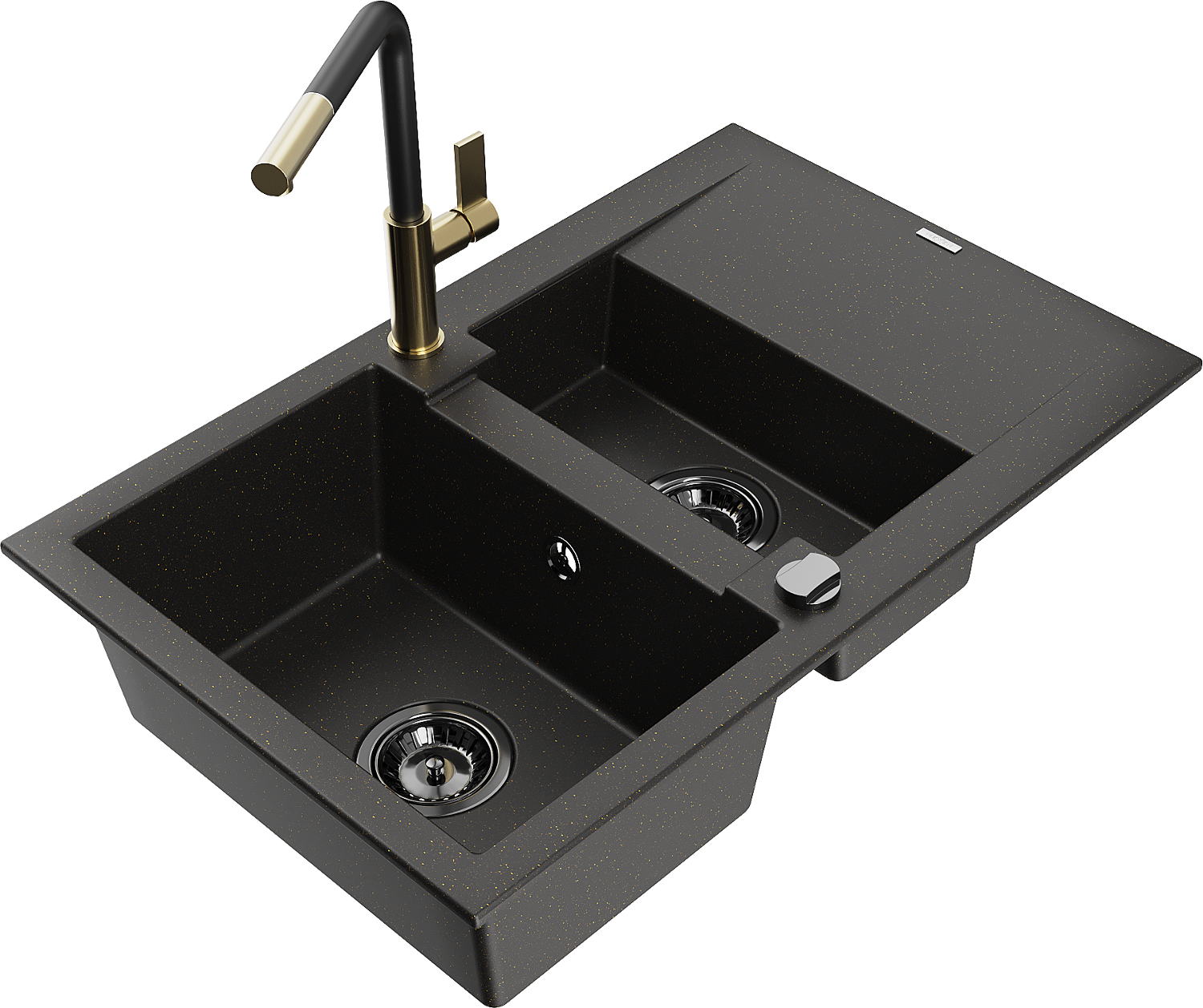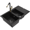 Mexen Gaspar žulový dřez 1,5-komorový s odkapávačem a kuchyňskou baterií Flora, černý/zlatý - 6507-75-670401-57-B