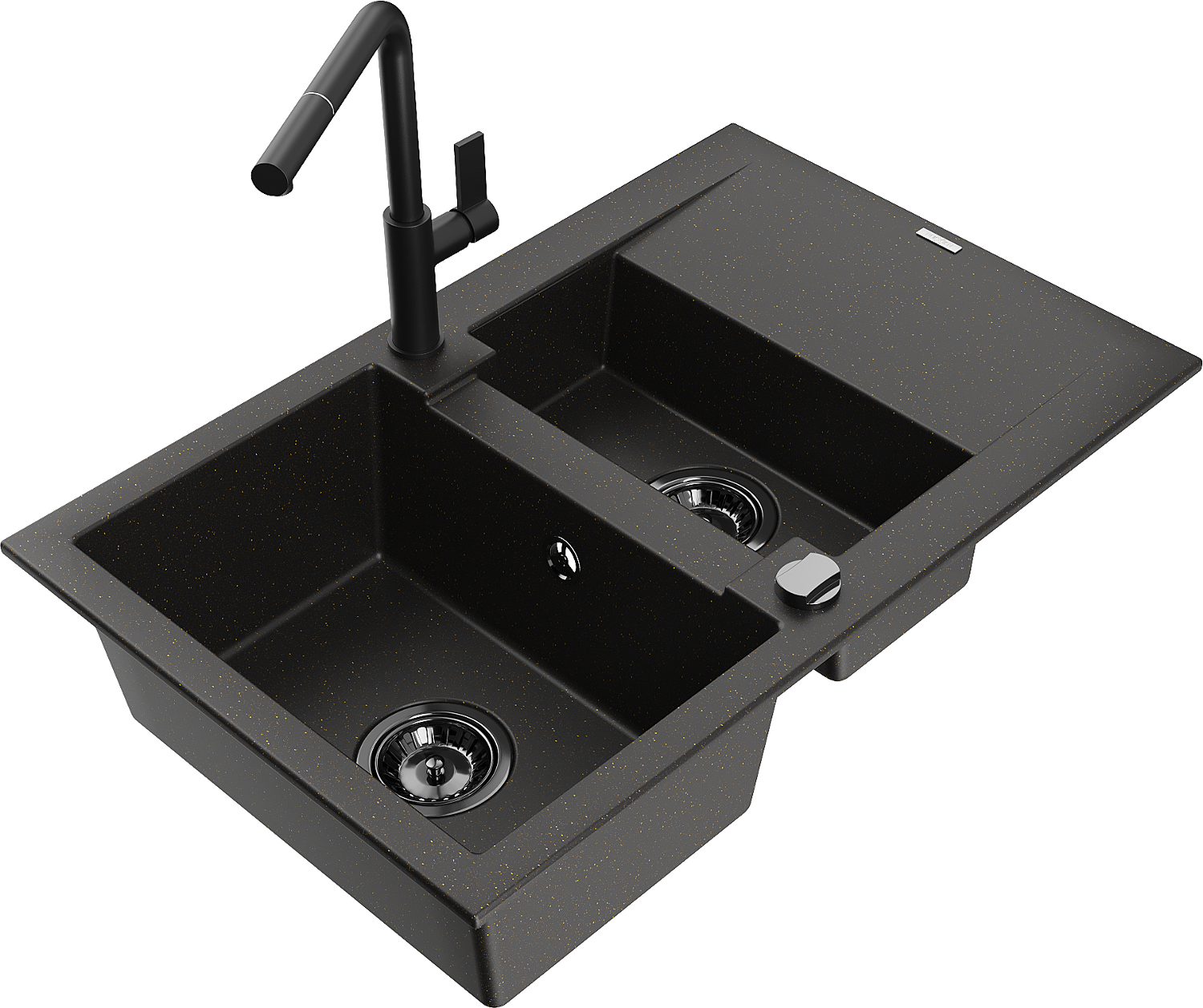 Mexen Gaspar granitový dřez 1,5 komorový s odkapávačem a kuchyňskou baterií Flora, černý/zlatý - 6507-75-670401-70-B