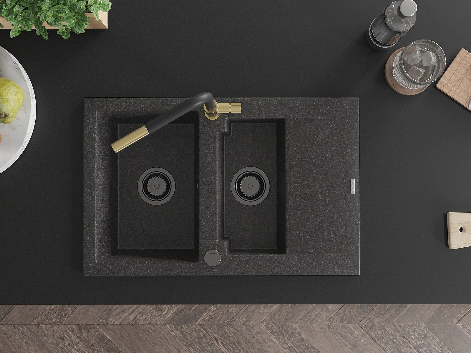 Mexen Gaspar granitový dřez 1,5-komorový s odkapávačem a kuchyňskou baterií Flora, černý s tečkami - 6507-76-670401-57-B