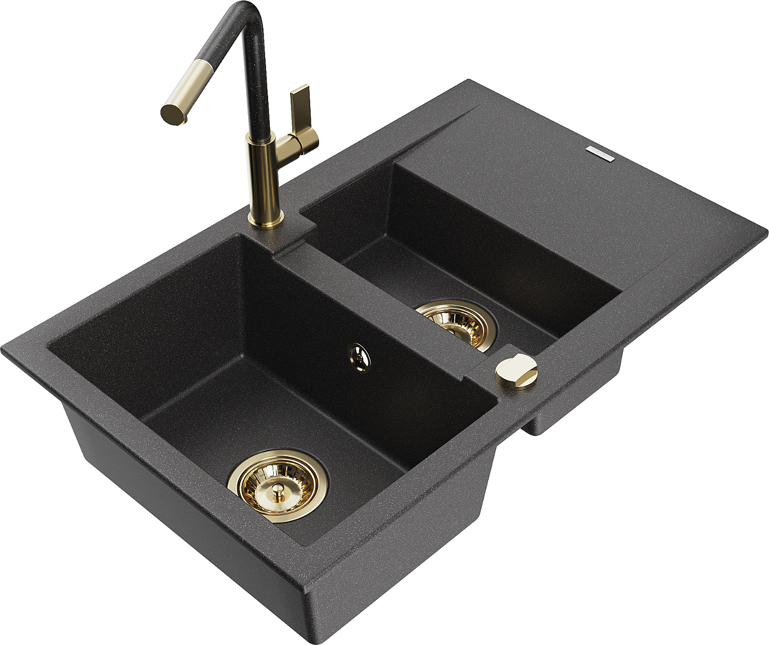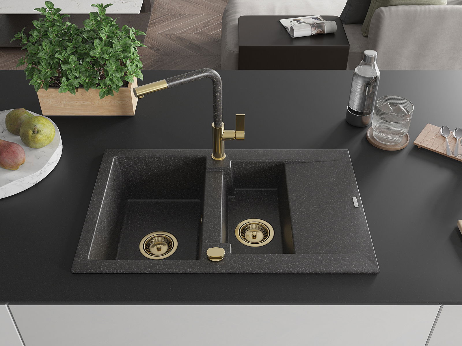 Mexen Gaspar granitový dřez 1,5-komorový s odkapávačem a kuchyňskou baterií Flora, černý tečkovaný - 6507-76-670401-75-G