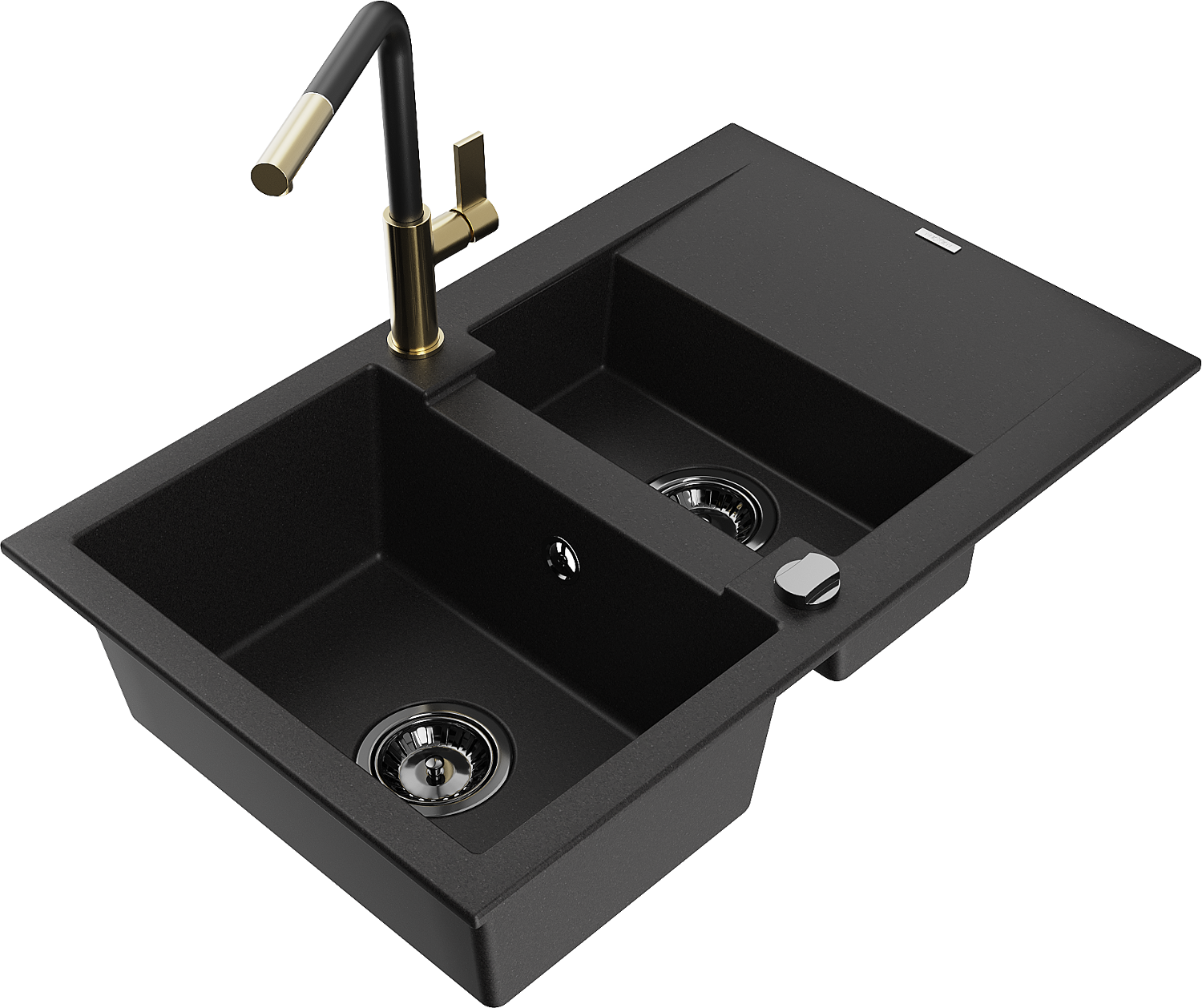 Mexen Gaspar granitový dřez 1,5-komorový s odkapávačem a kuchyňskou baterií Flora, černý - 6507-77-670401-57-B