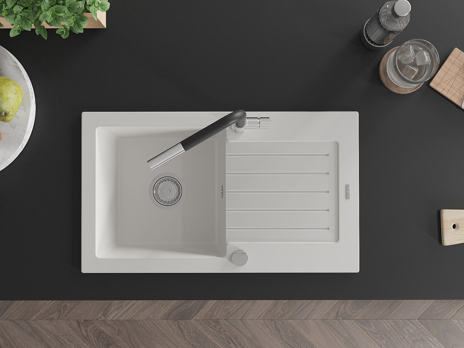 Mexen Pablo granitový dřez 1-komorový s odkapávačem a kuchyňskou baterií Flora, bílá - 6510-20-670401-07