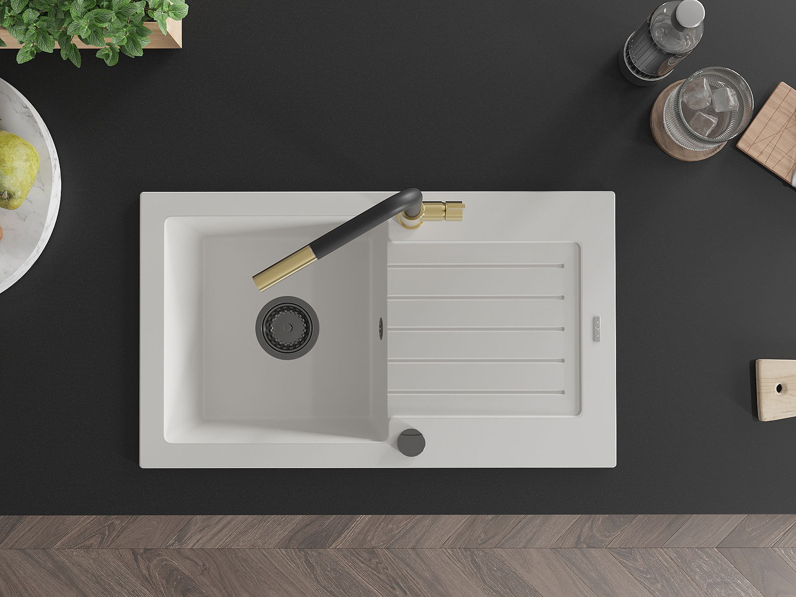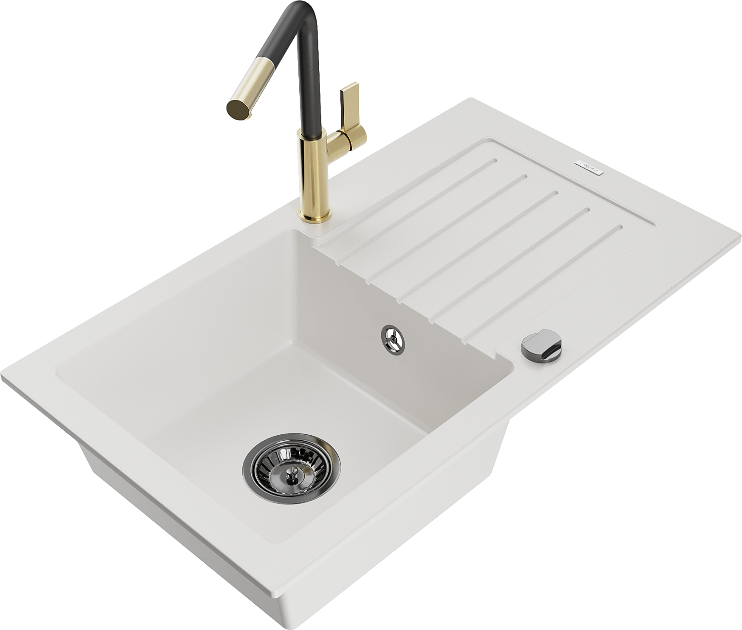 Mexen Pablo granitový dřez s 1 komorou, odkapávačem a kuchyňskou baterií Flora, bílý - 6510-20-670401-57-B