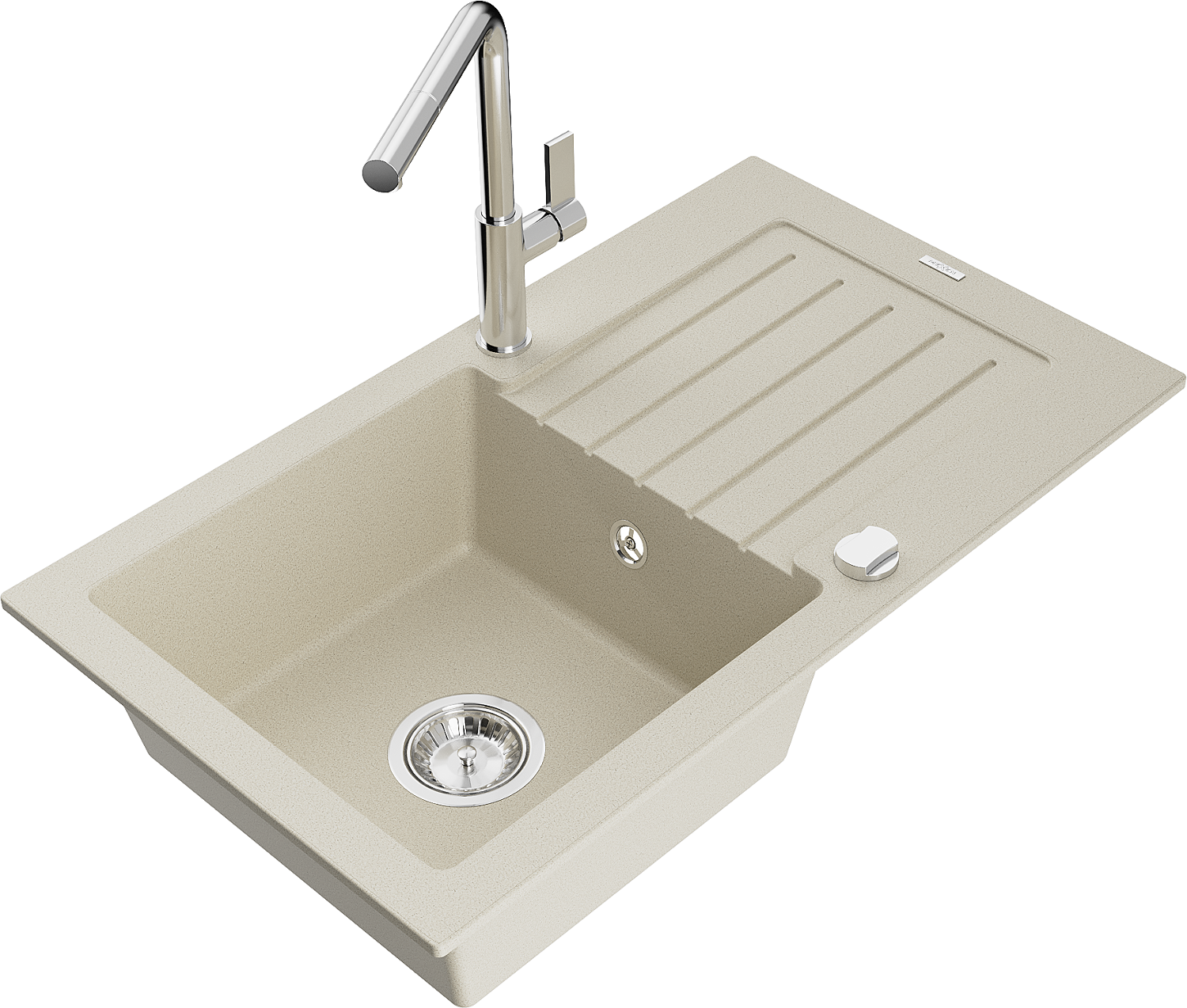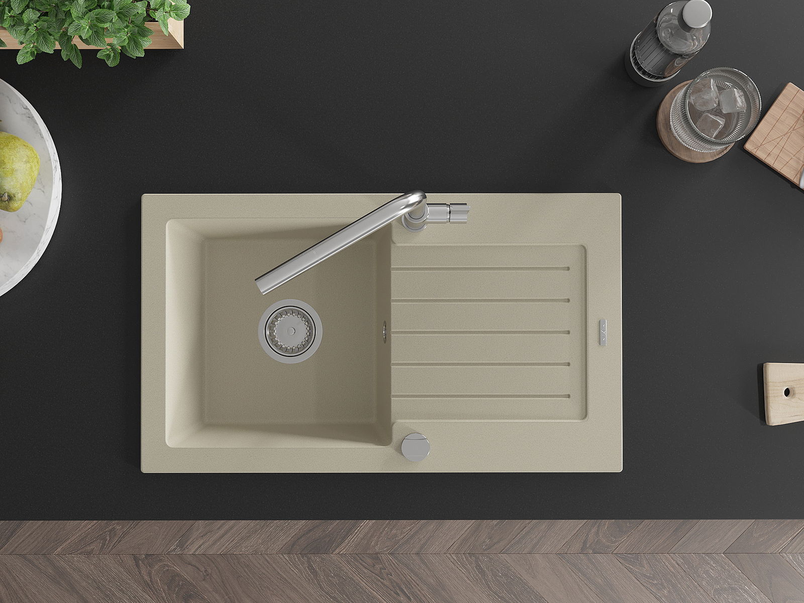 Mexen Pablo žulový dřez 1-komorový s odkapávačem a kuchyňskou baterií Flora, béžový - 6510-69-670401-00