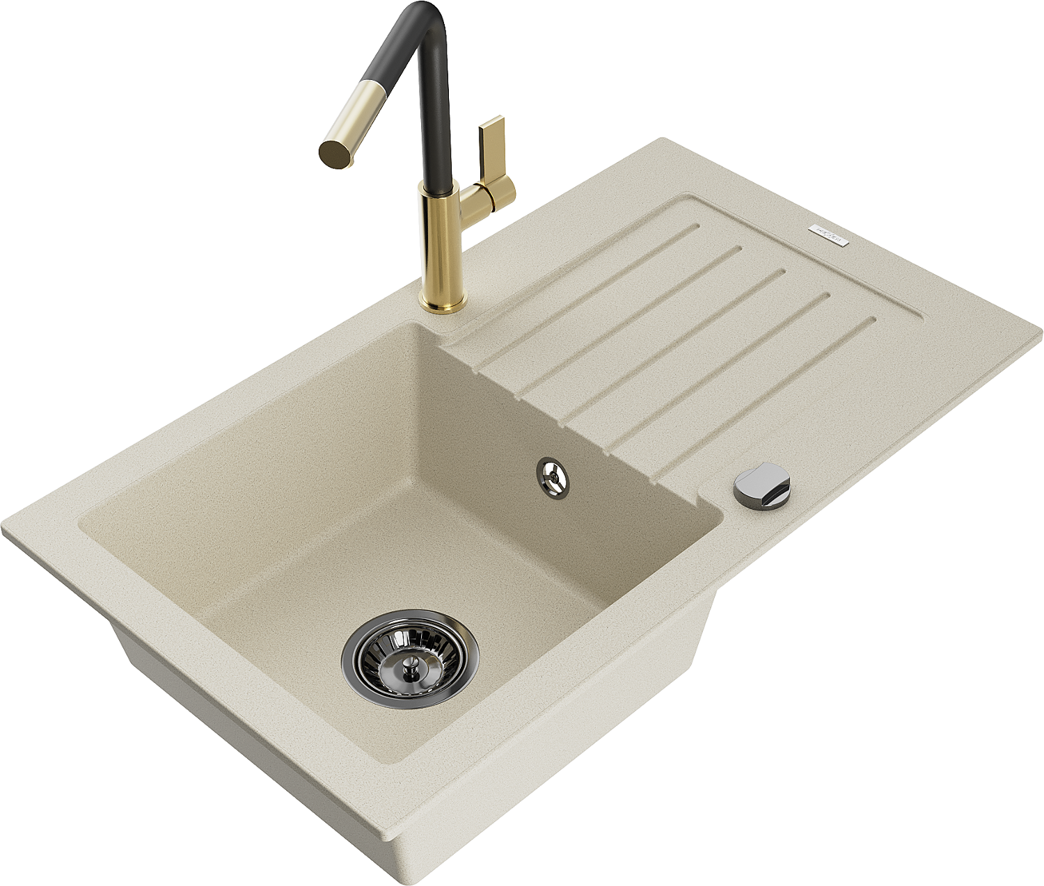 Mexen Pablo granitový dřez s jednou komorou, odkapávačem a kuchyňskou baterií Flora, béžový - 6510-69-670401-57-B
