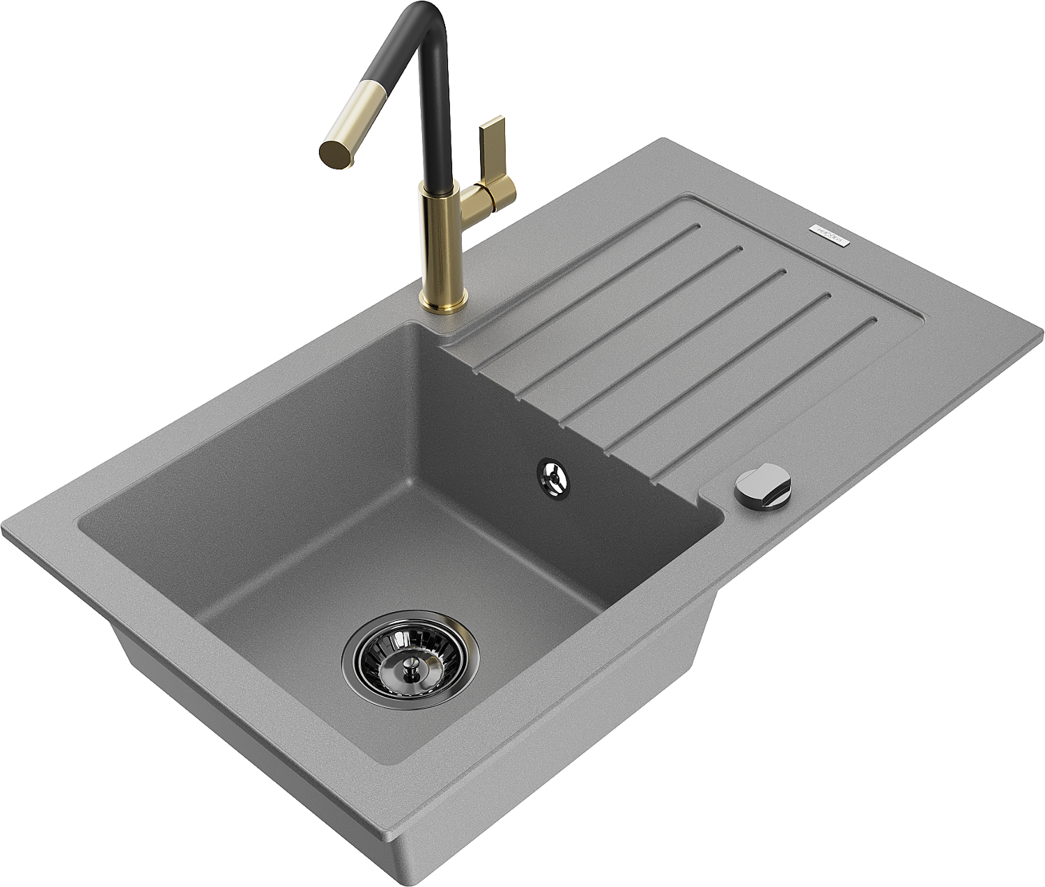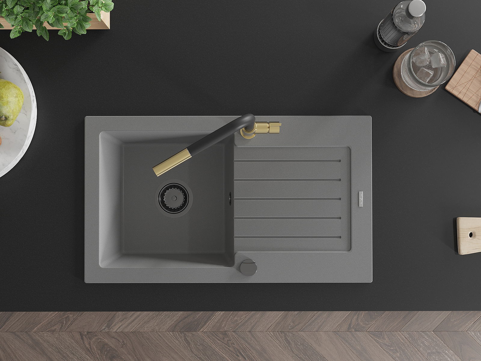 Mexen Pablo granitový kuchyňský dřez s odkapávačem a kuchyňskou baterií Flora, šedý - 6510-71-670401-57-B