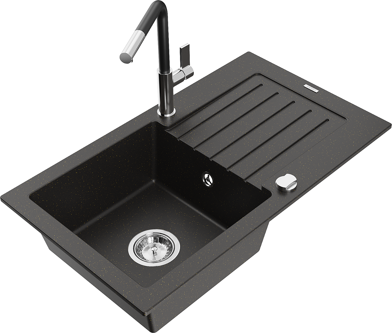 Mexen Pablo granitový dřez 1-komorový s odkapávačem a kuchyňskou baterií Flora, černý/zlatý metalik - 6510-75-670401-07
