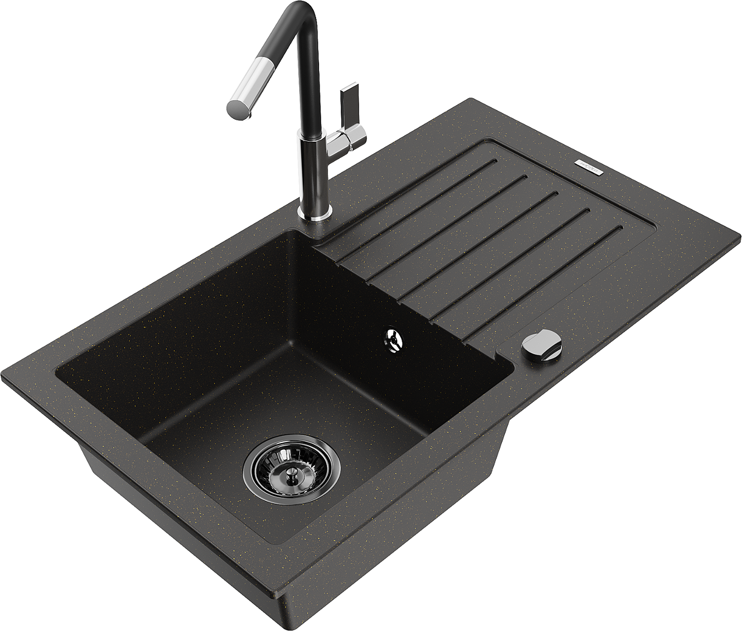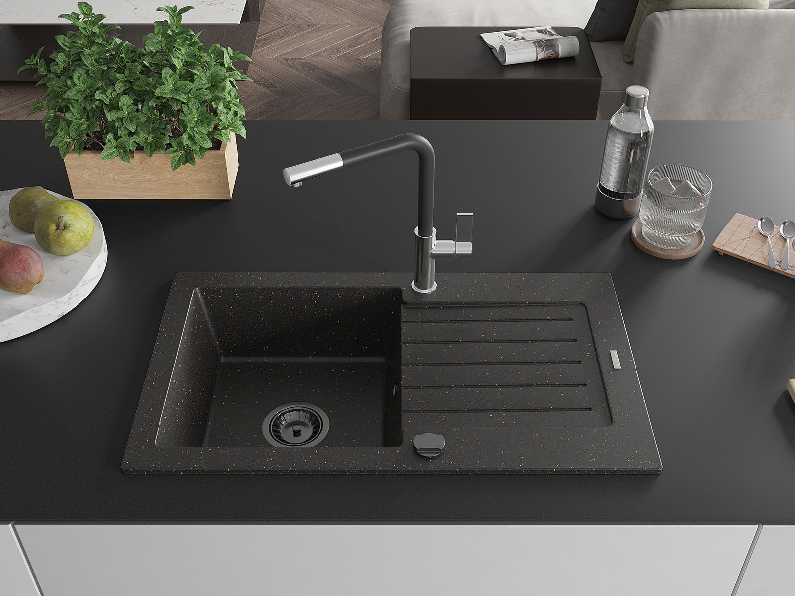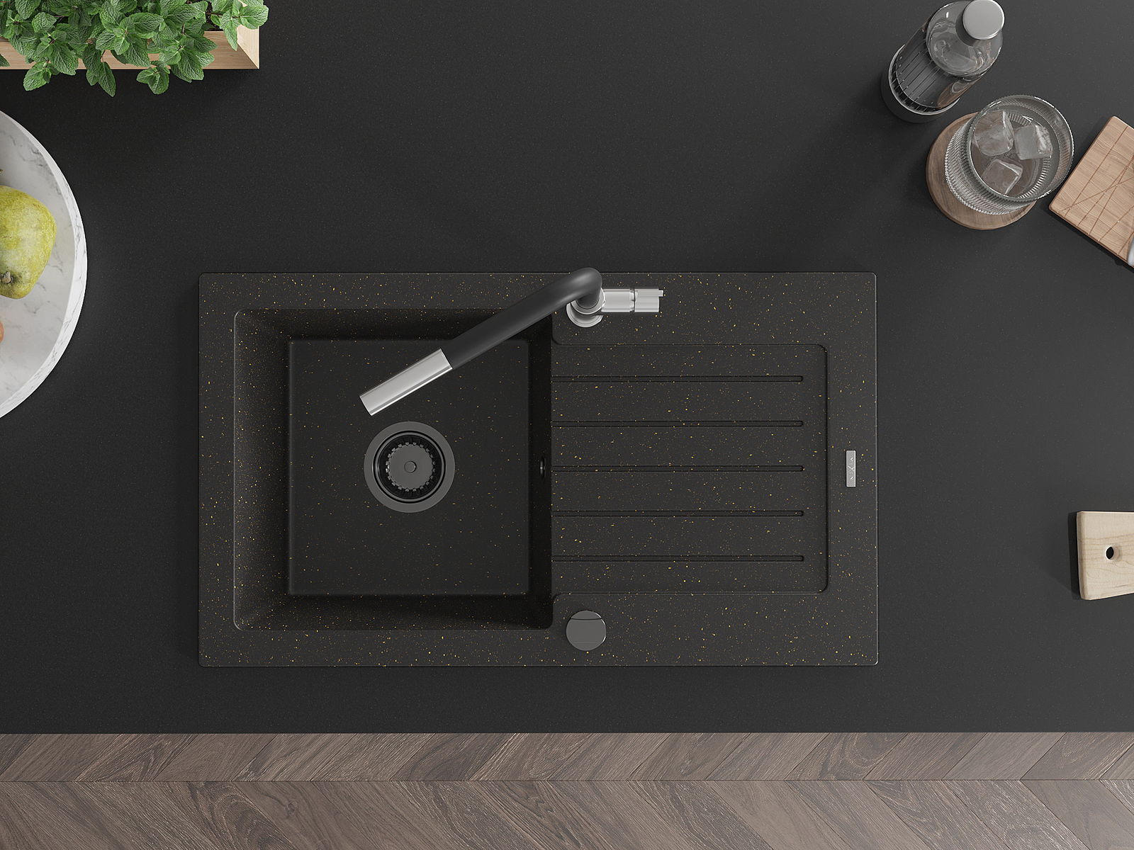 Mexen Pablo granitový dřez 1-komorový s odkapávačem a kuchyňskou baterií Flora, černý/zlatý metalík - 6510-75-670401-07-B