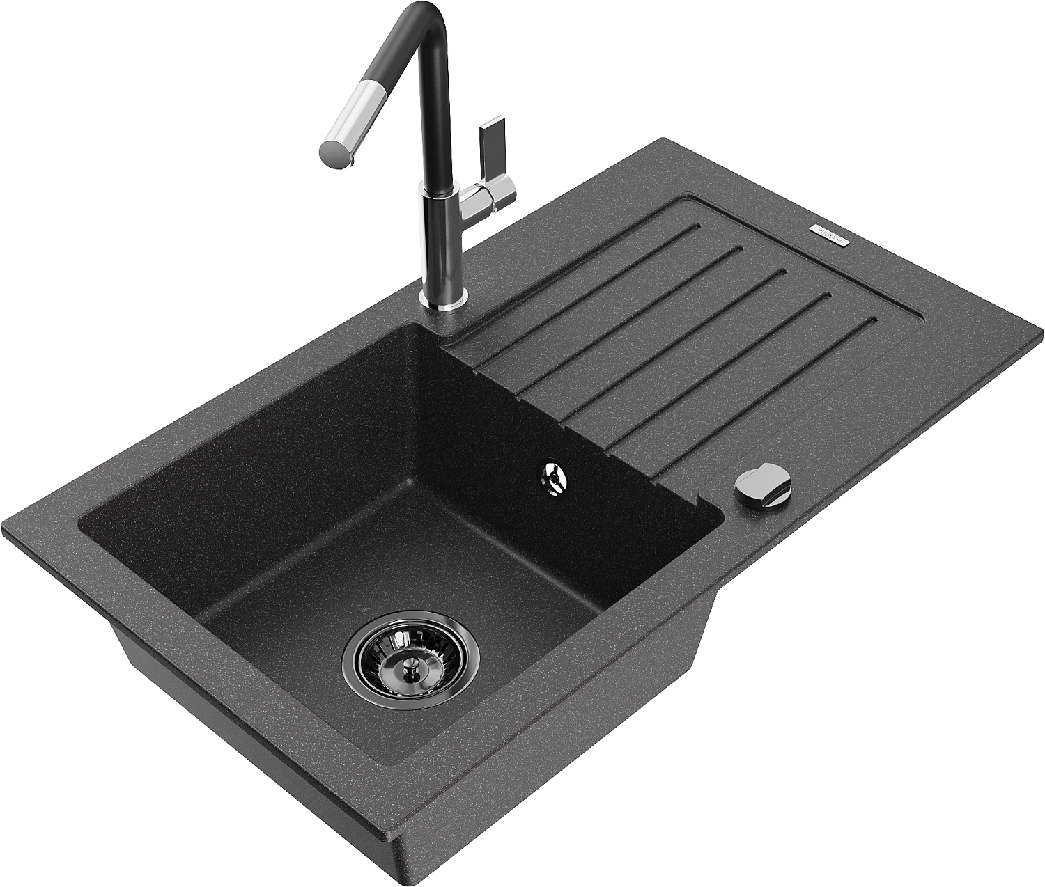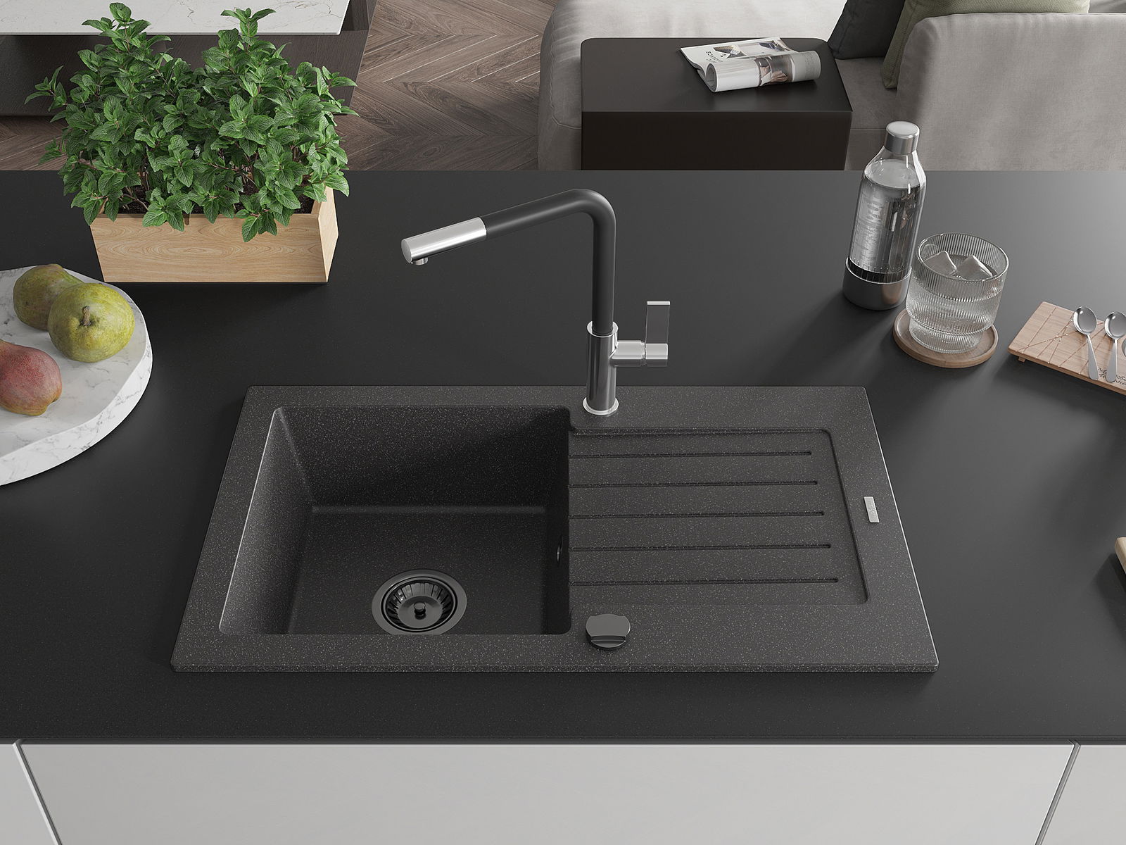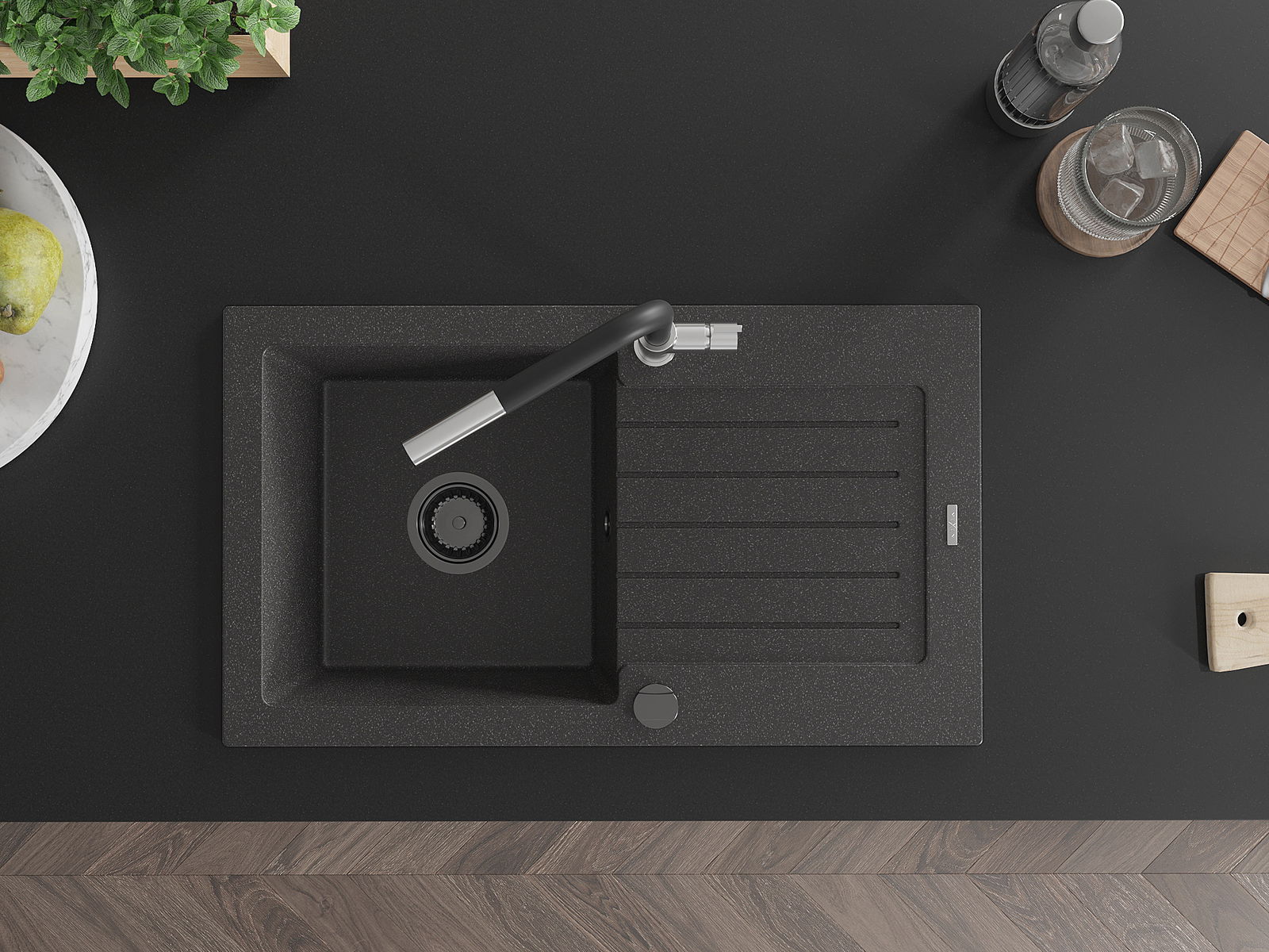 Mexen Pablo granitový dřez s 1 komorou, odkapávačem a kuchyňskou baterií Flora, černý skvrnitý - 6510-76-670401-07-B