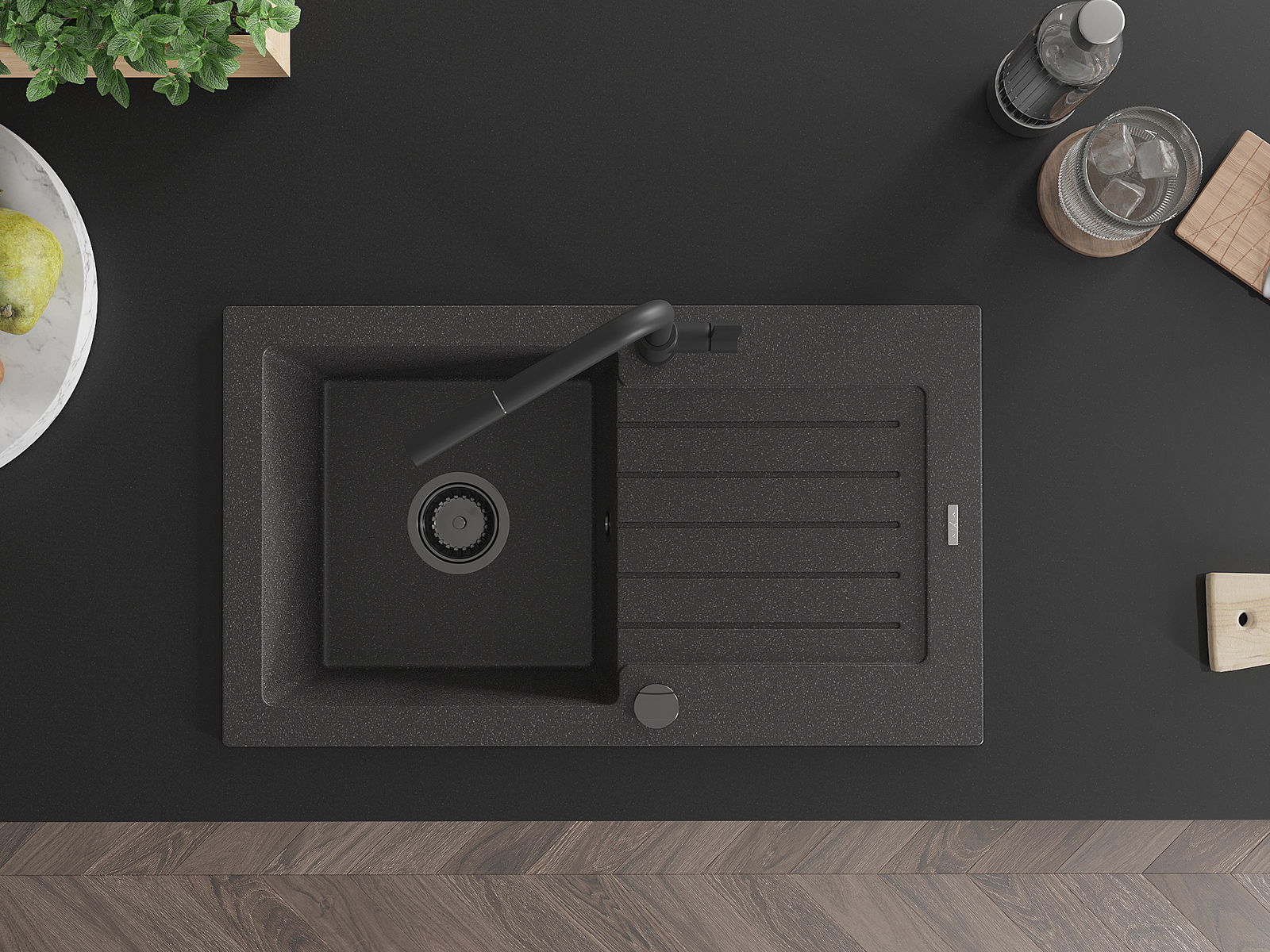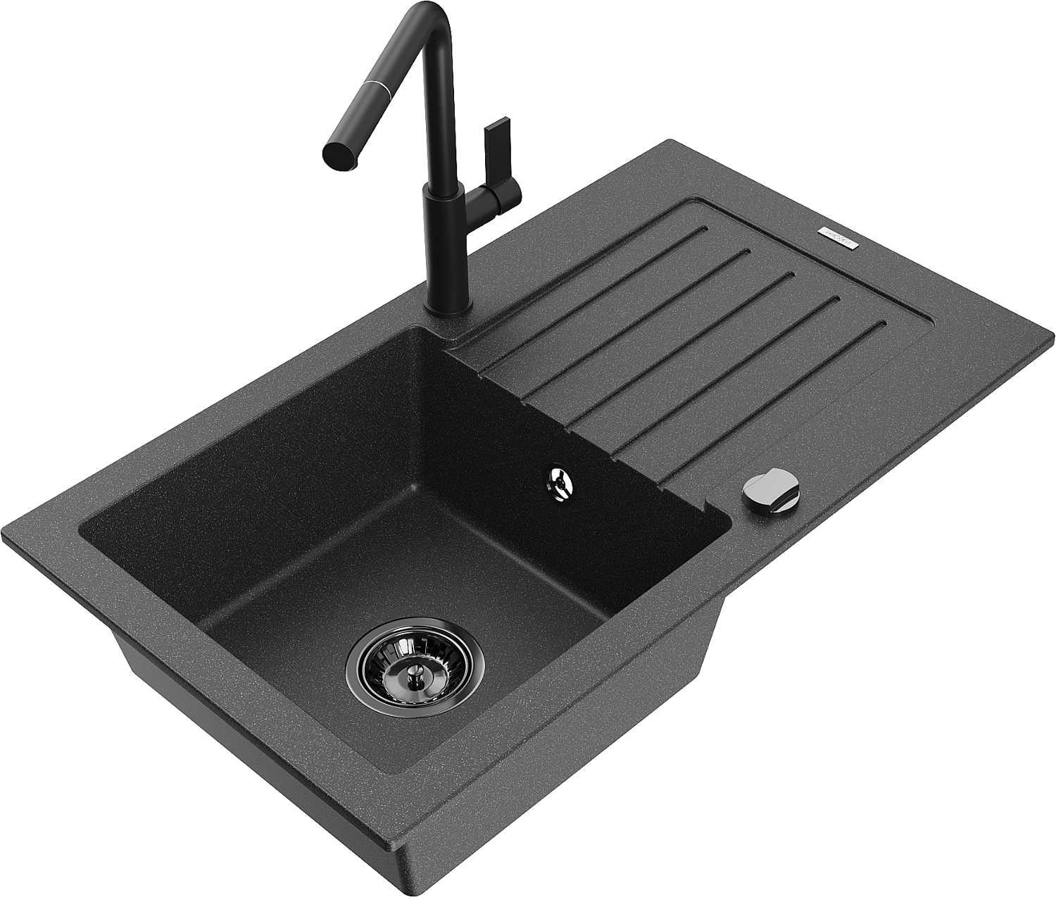 Mexen Pablo žulový dřez s 1 komorou, odkapávačem a kuchyňskou baterií Flora, černý s postříkáním - 6510-76-670401-70-B