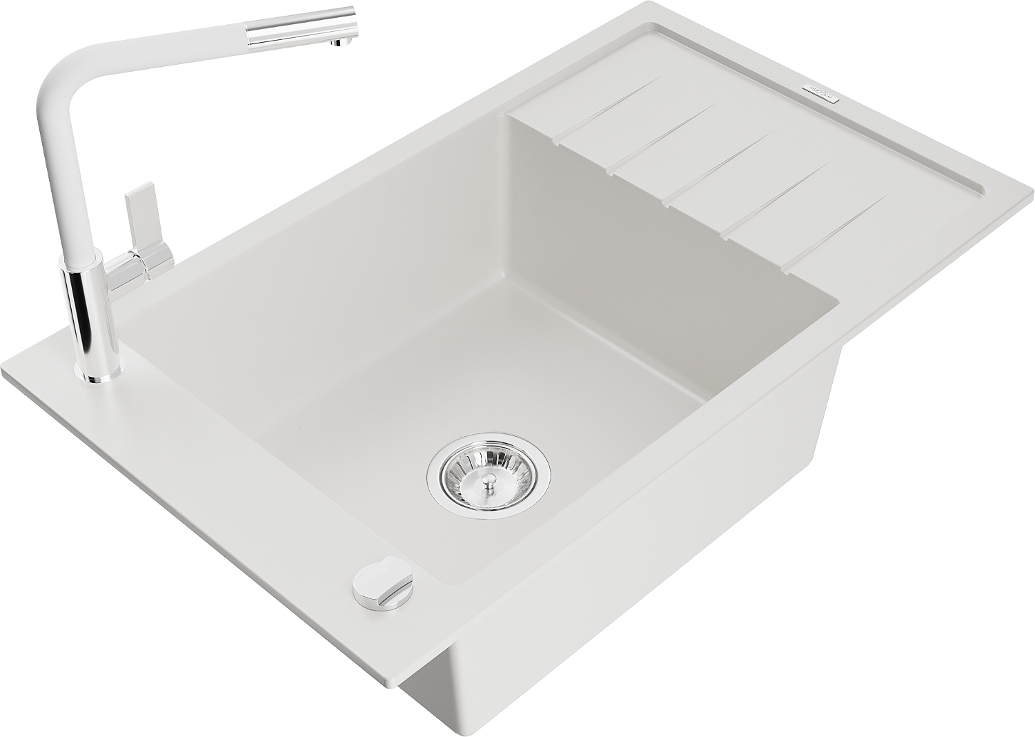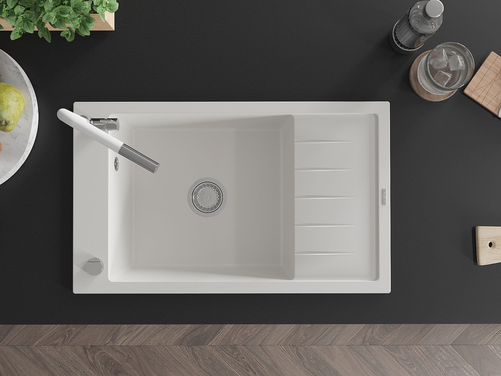 Mexen Elias dřez granitový 1-komorový s odkapávačem a kuchyňskou baterií Flora, bílý - 6511-20-670401-02