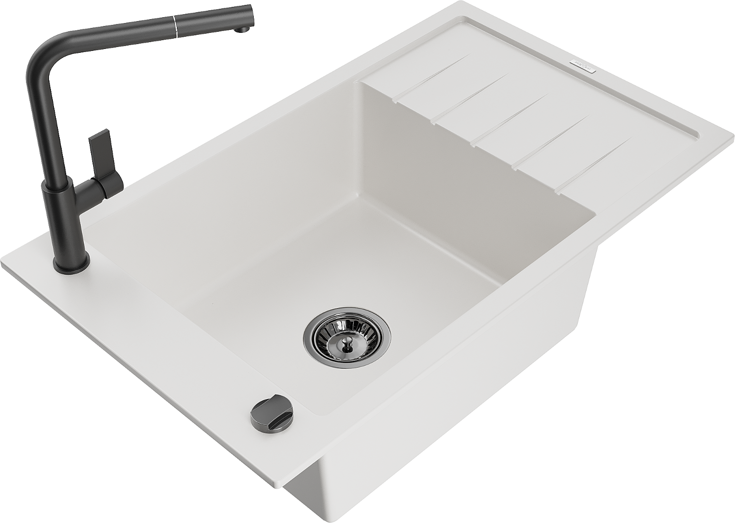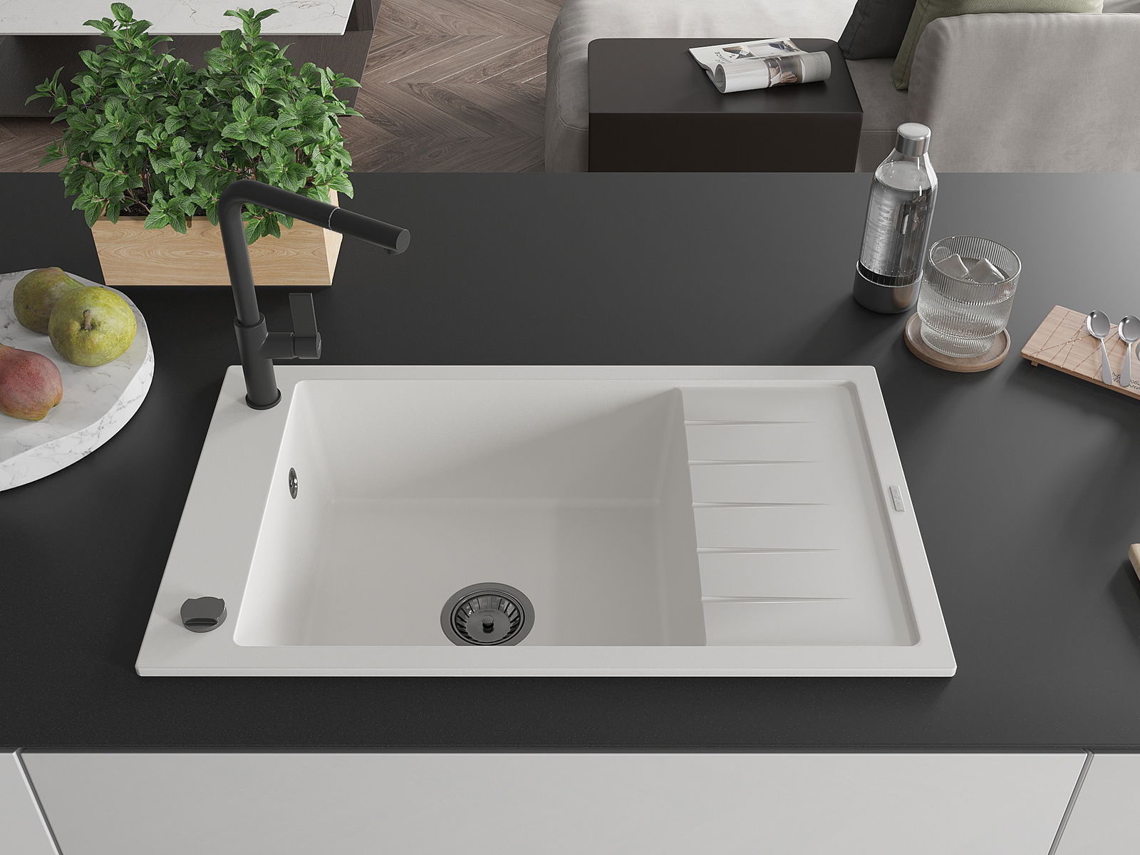 Mexen Elias granitový dřez 1-komorový s odkapávačem a kuchyňskou baterií Flora, bílý - 6511-20-670401-70-B