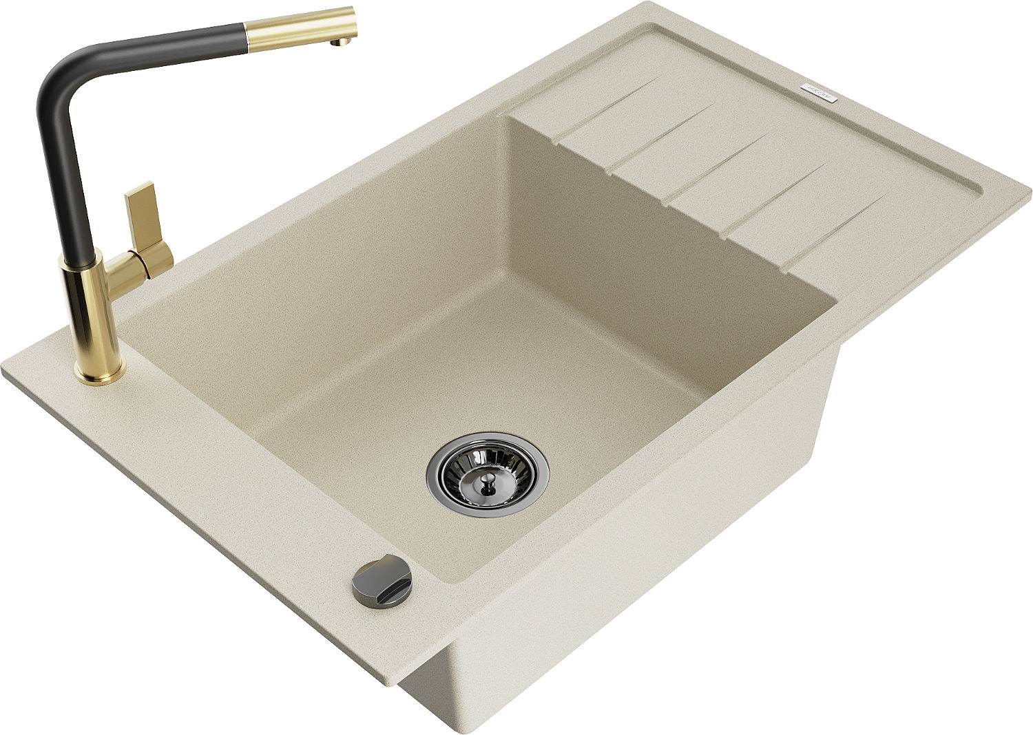 Mexen Elias granitový dřez s 1 komorou s odkapávačem a kuchyňskou baterií Flora, béžový - 6511-69-670401-57-B