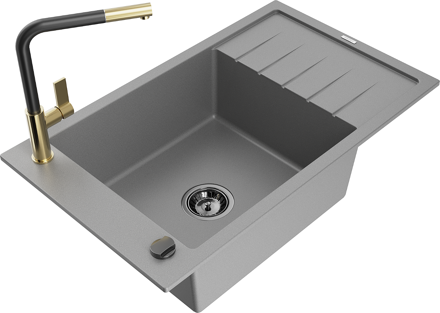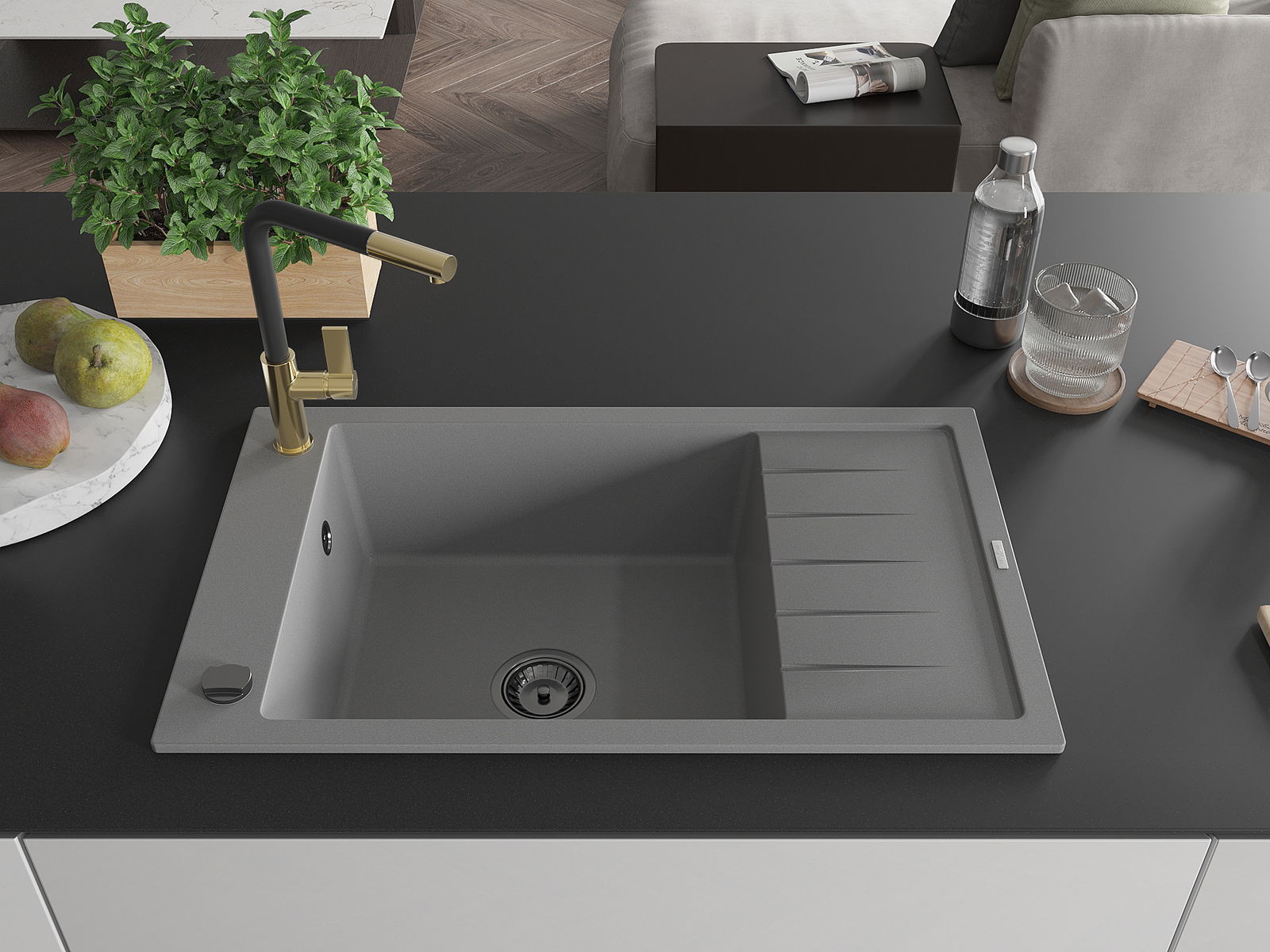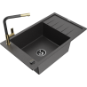 • Mexen Elias granitový dřez 1-komorový s odkapávačem a kuchyňskou baterií Flora, šedý - 6511-71-670401-57-B