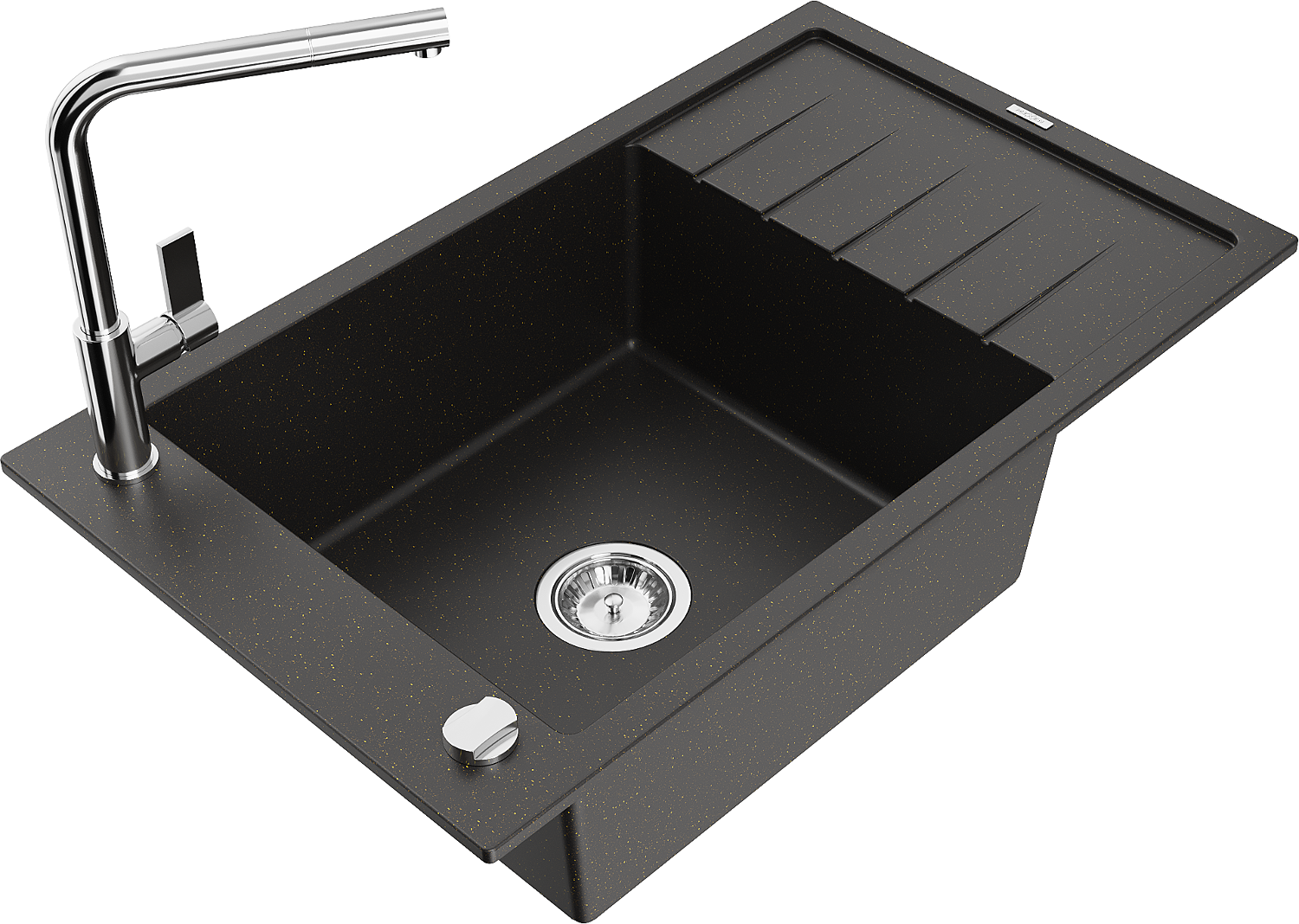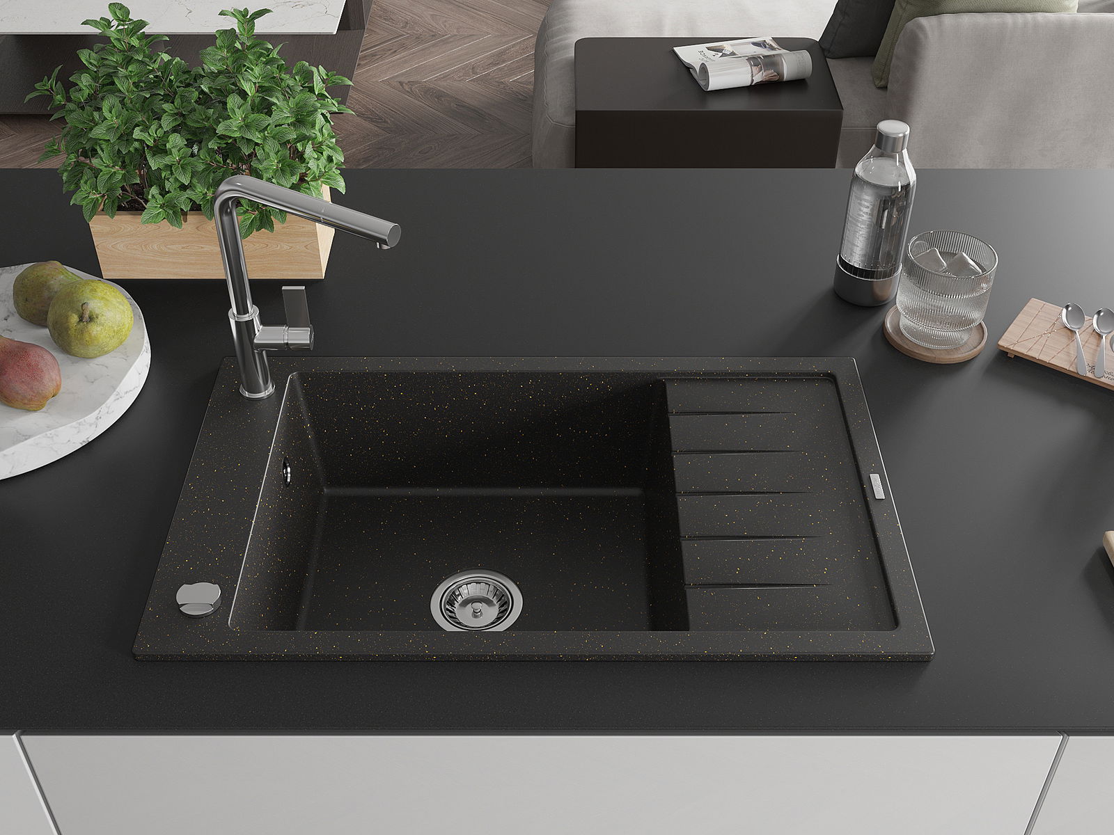 Mexen Elias dřez granitový 1-komorový s odkapávačem a kuchyňskou baterií Flora, černý/zlatý metalik - 6511-75-670401-00
