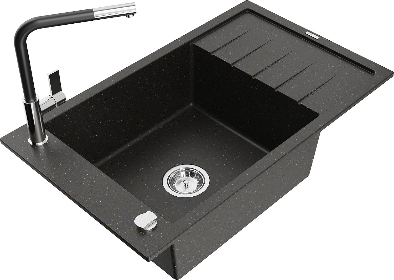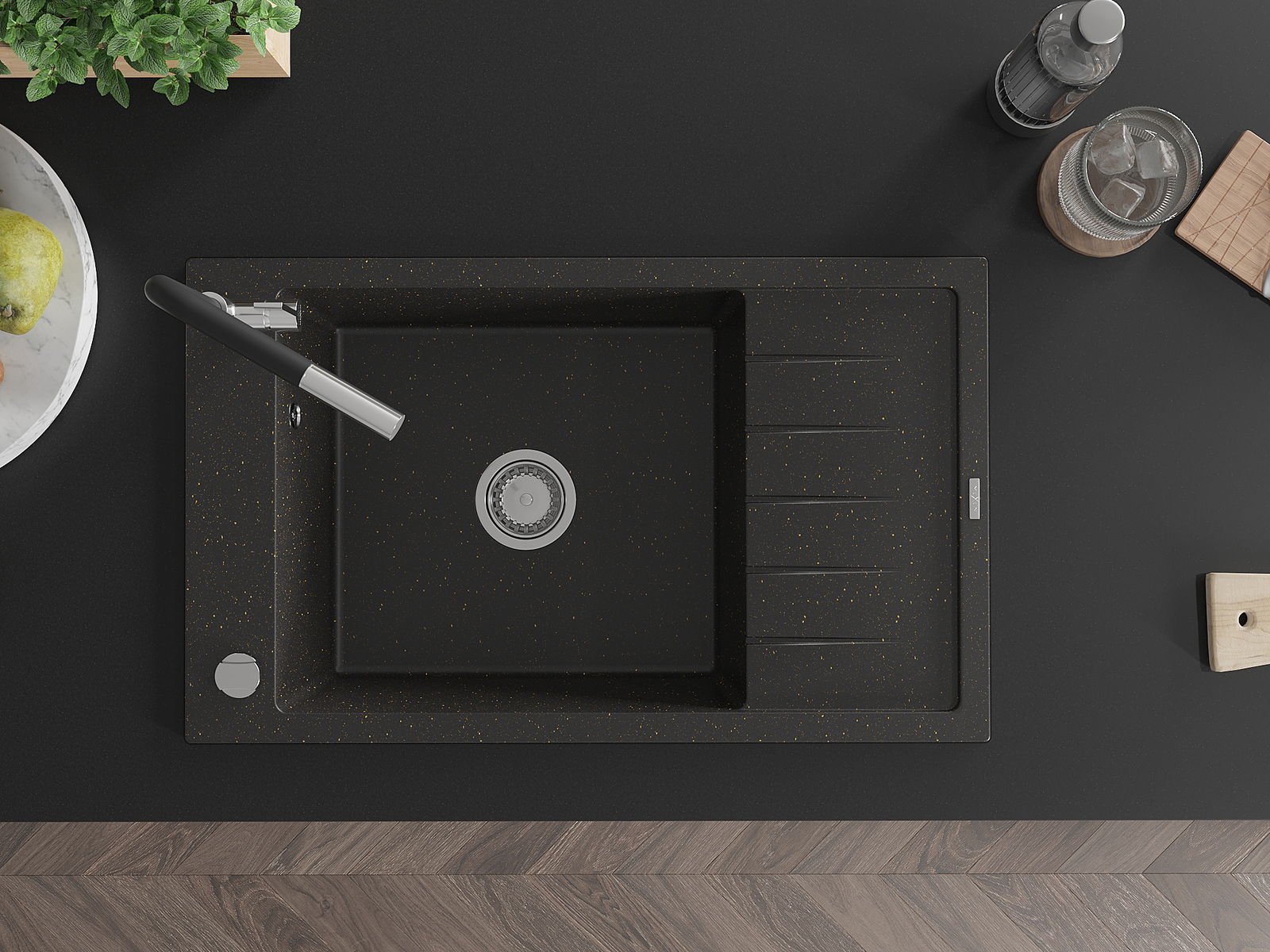 Mexen Elias granitový dřez s 1 komorou, odkapávačem a kuchyňskou baterií Flora, černý/zlatý metalik - 6511-75-670401-07