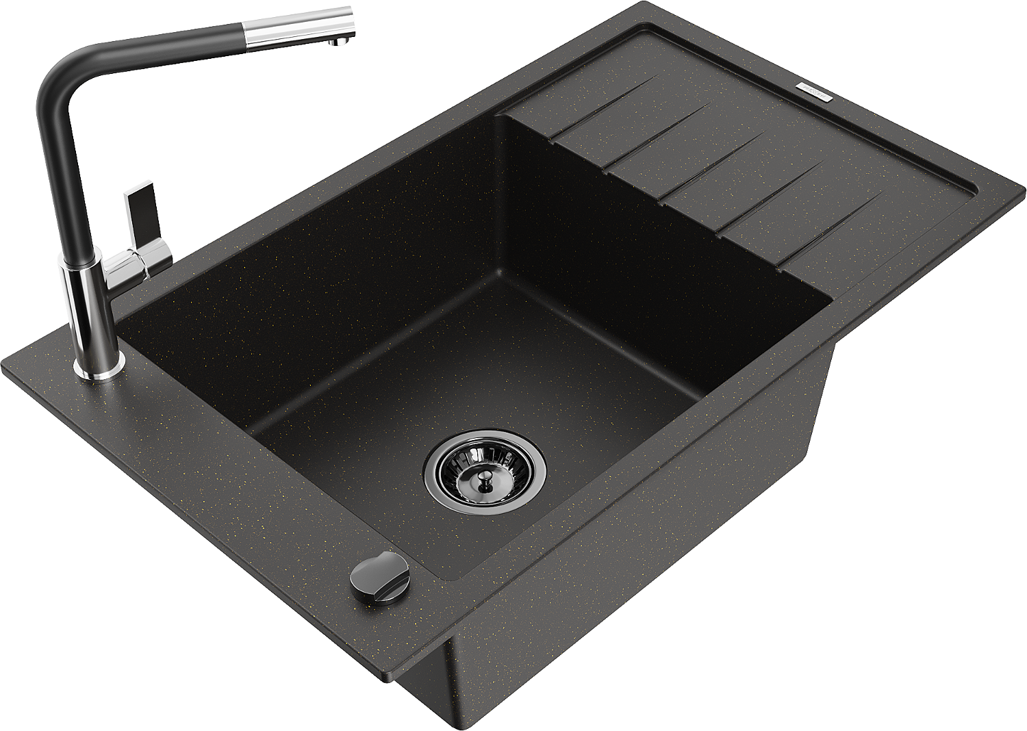 Mexen Elias granitový dřez s jednou komorou s odkapávačem a kuchyňskou baterií Flora, černý/zlatý metalik - 6511-75-670401-07-B