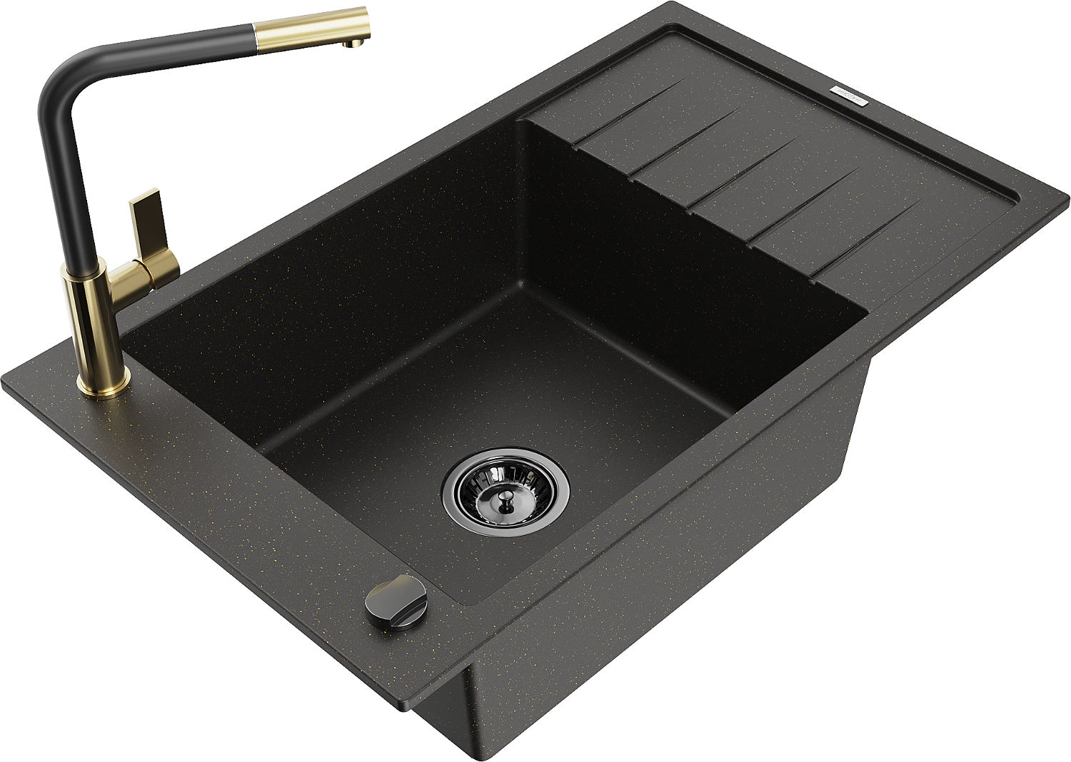 Mexen Elias granitový dřez 1-komorový s odkapávačem a kuchyňskou baterií Flora, černý/zlatý metalik - 6511-75-670401-57-B