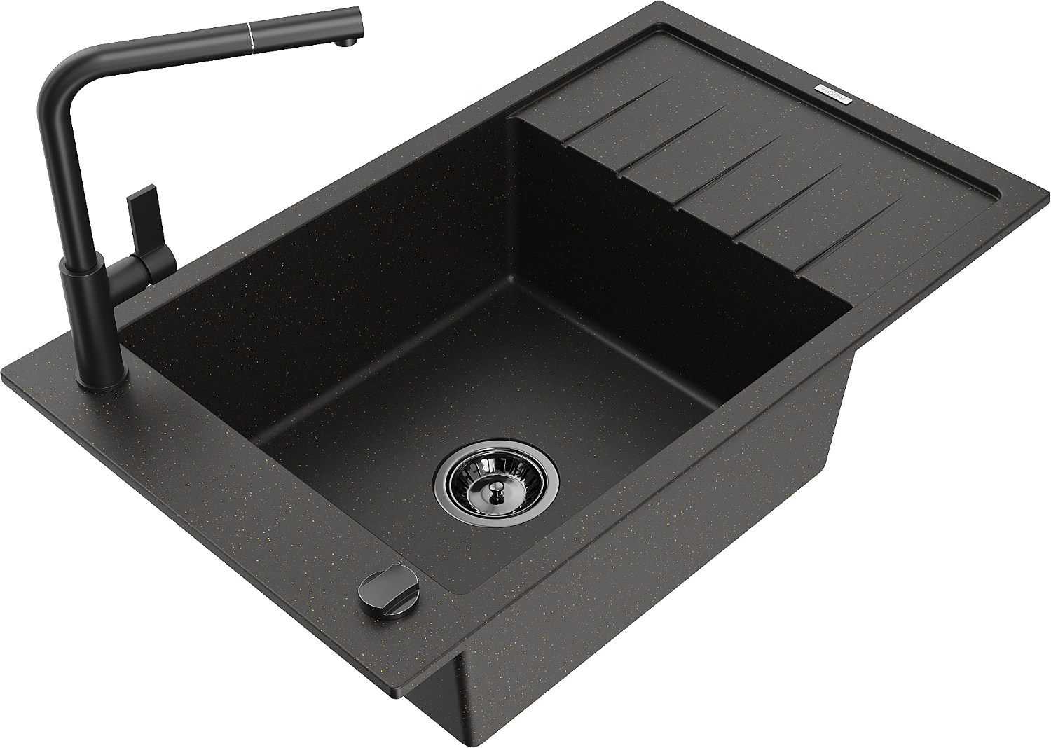 Mexen Elias granitový dřez 1-komorový s odkapávačem a kuchyňskou baterií Flora, černý/zlatý metalický - 6511-75-670401-70-B