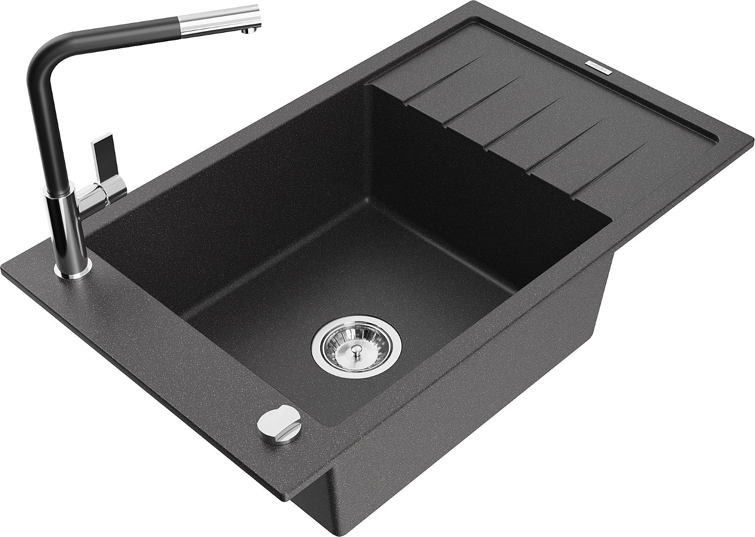 Mexen Elias granitový dřez 1-komorový s odkapávačem a kuchyňskou baterií Flora, černý skvrnitý - 6511-76-670401-07