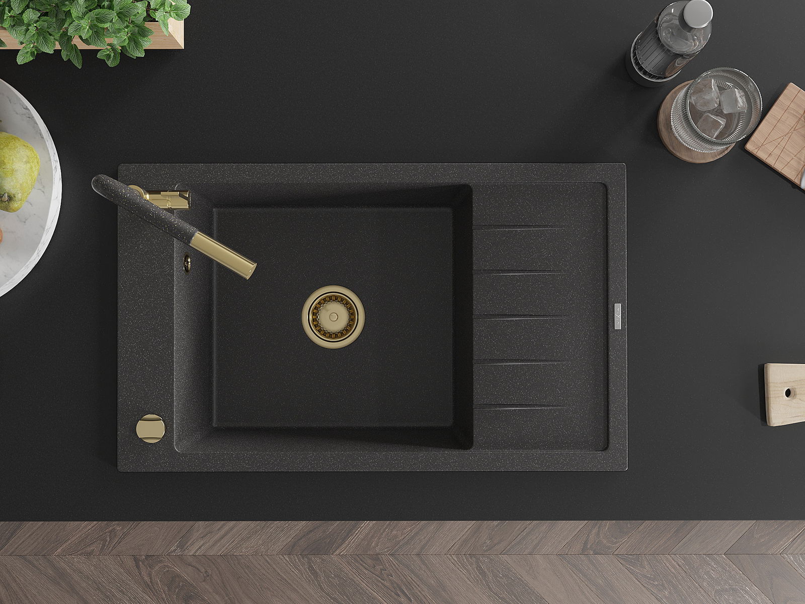 Dřez má předfrézovaný otvor o průměru 35 mm k samostatnému proražení. Může být použit například k montáži dávkovače na tekutinu, který eliminuje přítomnost plastových lahví v kuchyni a dodá jí elegantní finiš.