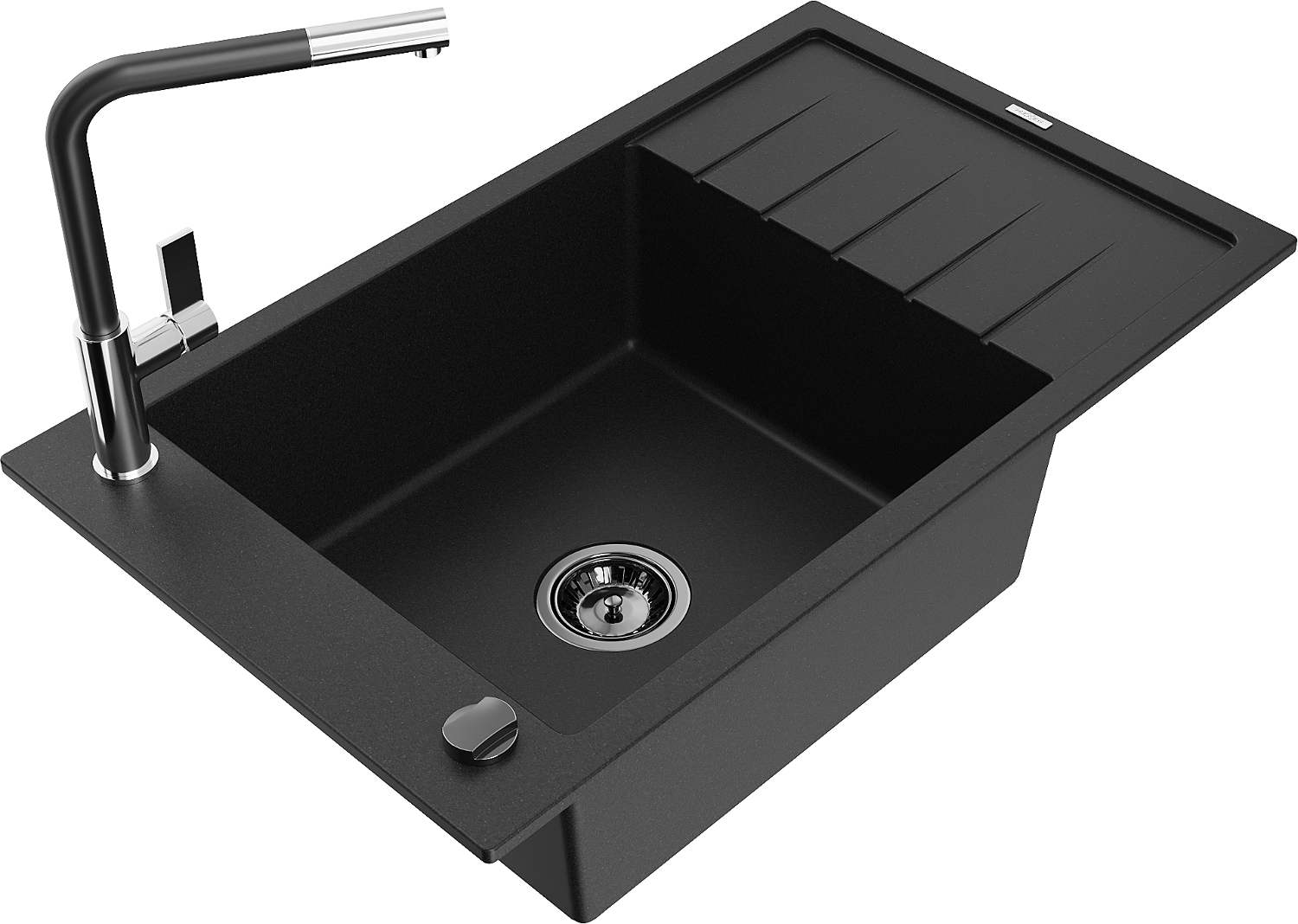Mexen Elias granitový dřez 1-komorový s odkapávačem a kuchyňskou baterií Flora, černý - 6511-77-670401-07-B