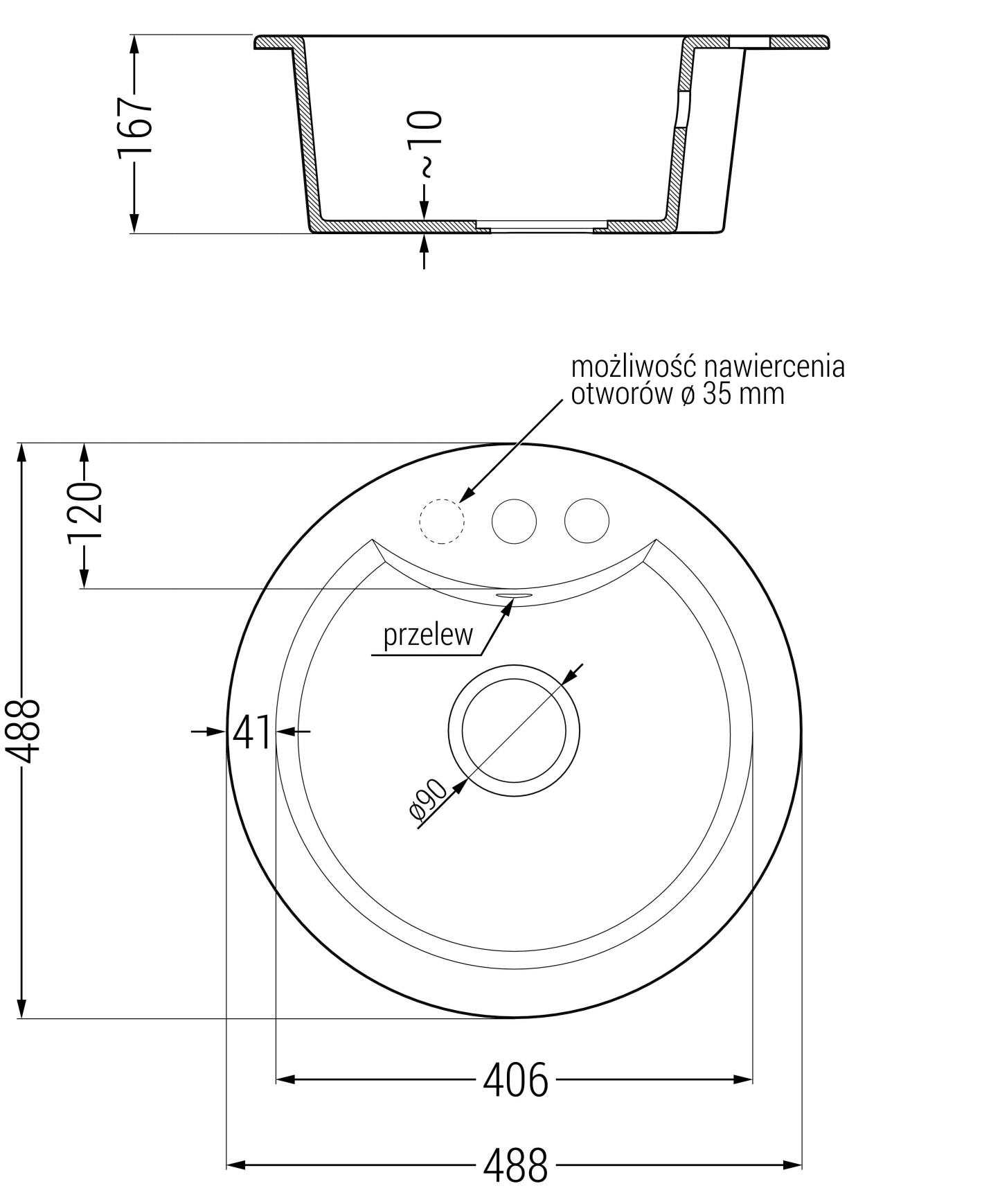 Dřez má předfrézovaný otvor o průměru 35 mm k samostatnému proražení. Může být použit například k montáži dávkovače na tekutinu, který eliminuje přítomnost plastových lahví v kuchyni a dodá jí elegantní finiš.