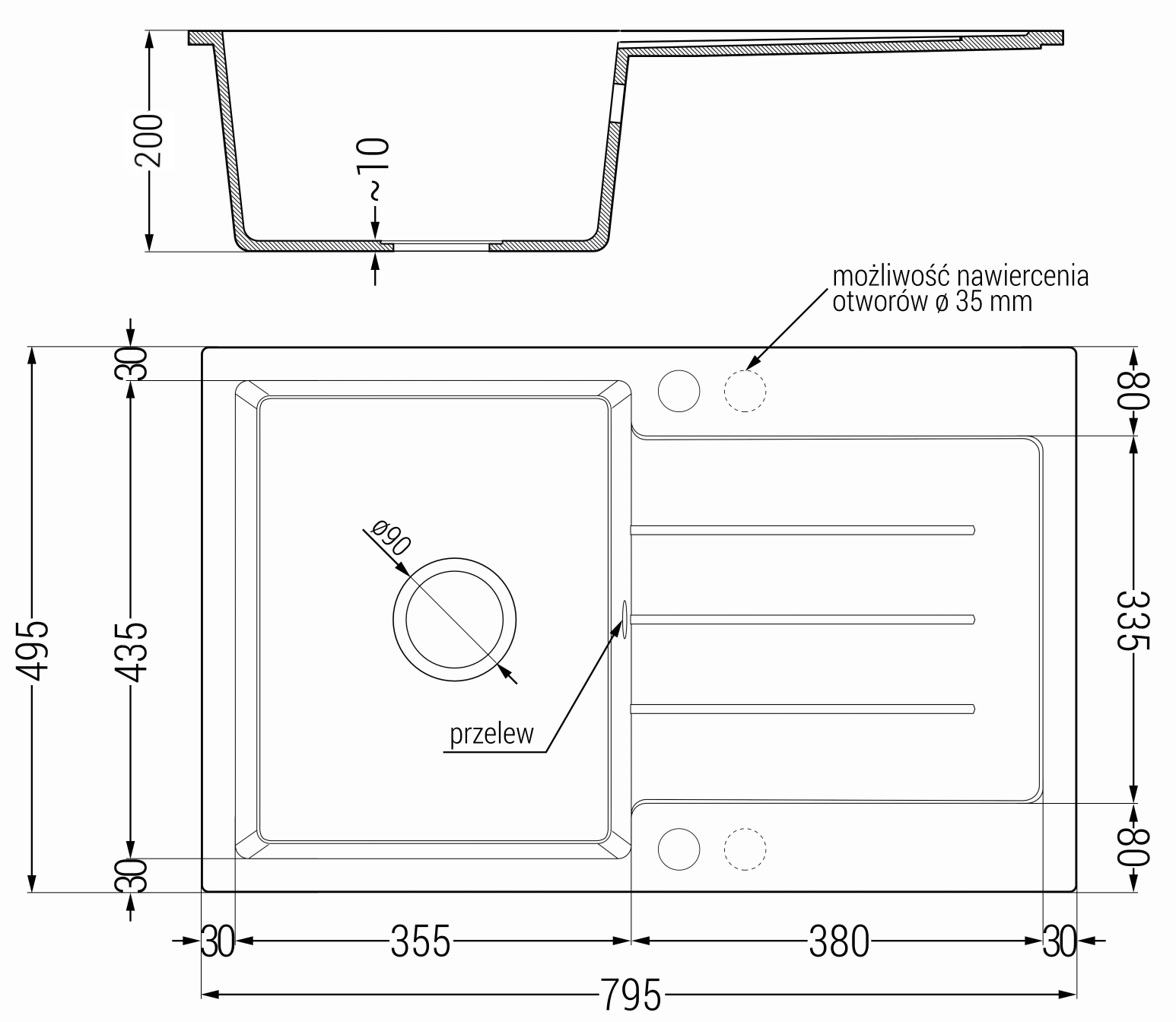 Dřez má 2 předvrtané otvory o průměru 35 mm, které lze samostatně vyrazit. Mohou být použity mimo jiné k montáži dávkovače tekutin, který eliminuje přítomnost plastových lahví v kuchyni a dodá jí elegantní vzhled.