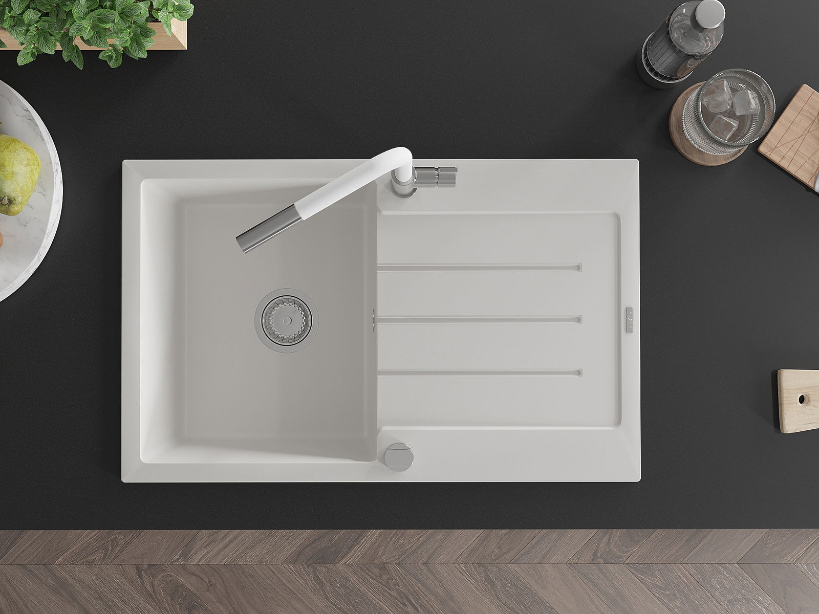 Mexen Bruno granitový dřez 1-komorový s odkapávačem a kuchyňskou baterií Flora, bílý - 6513-20-670401-02