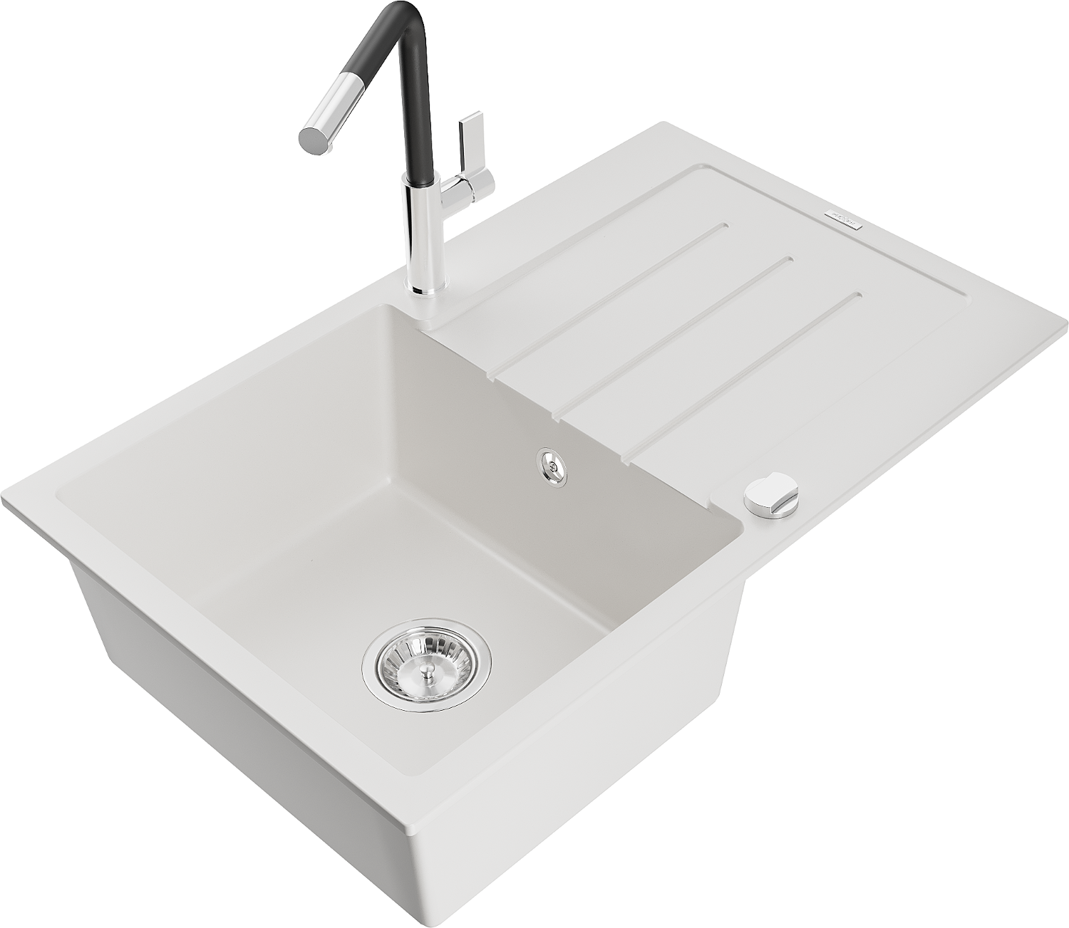 Mexen Bruno granitový dřez 1-komorový s odkapávačem a kuchyňskou baterií Flora, bílý - 6513-20-670401-07
