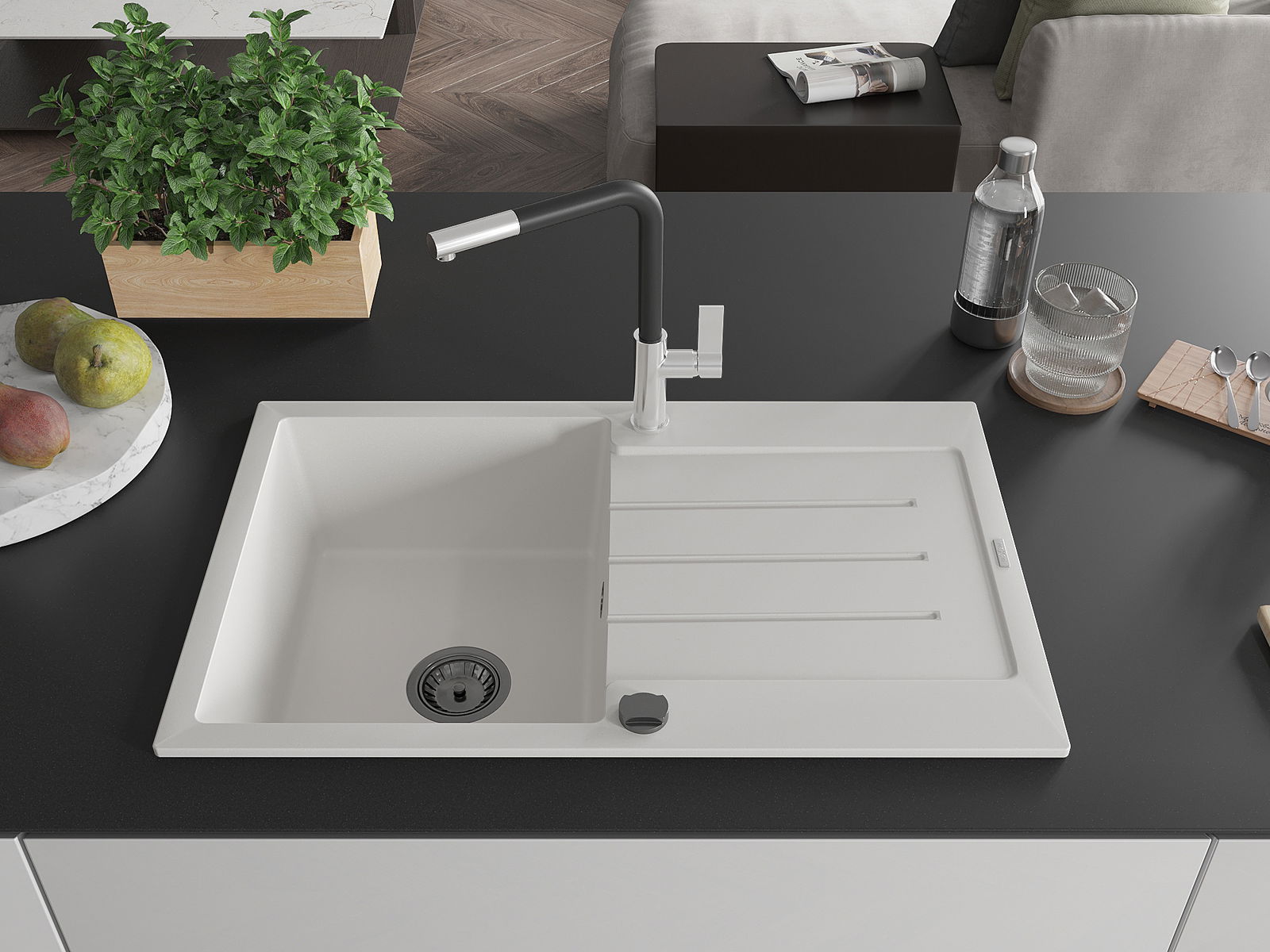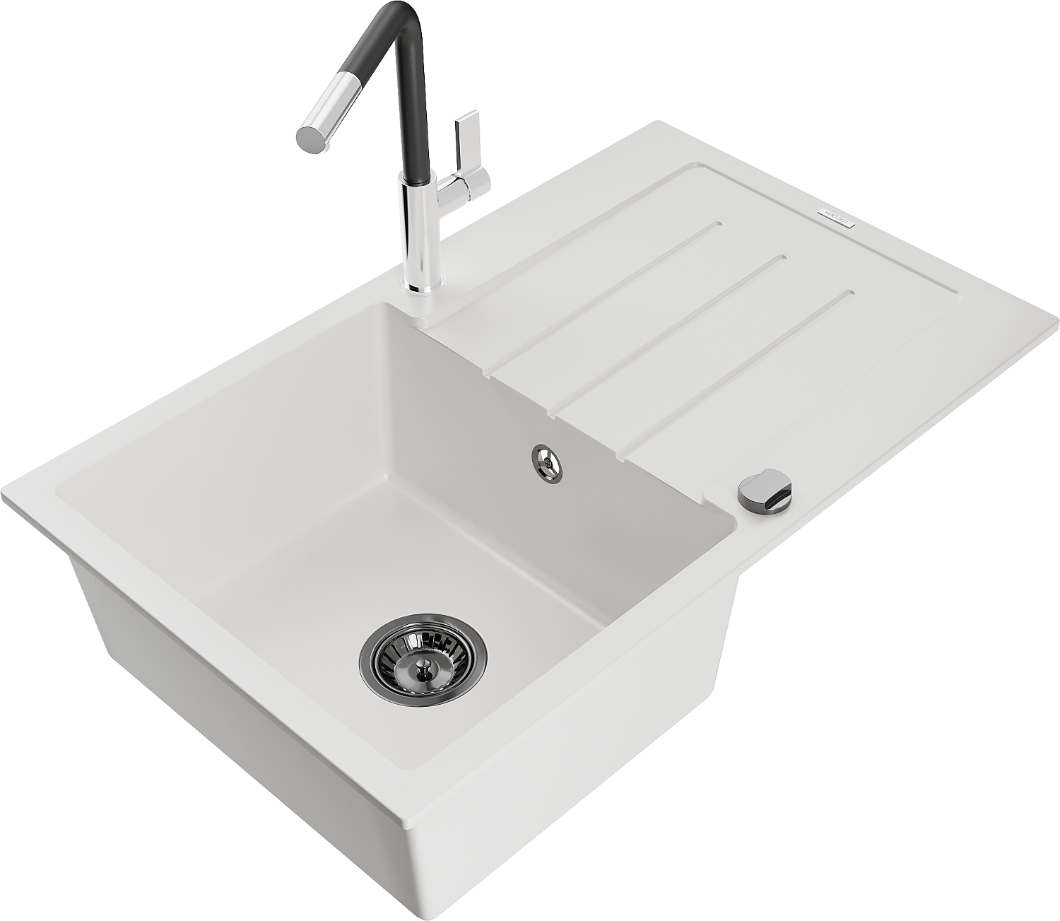 Mexen Bruno granitový dřez 1-komorový s odkapávačem a kuchyňskou baterií Flora, bílý - 6513-20-670401-07-B