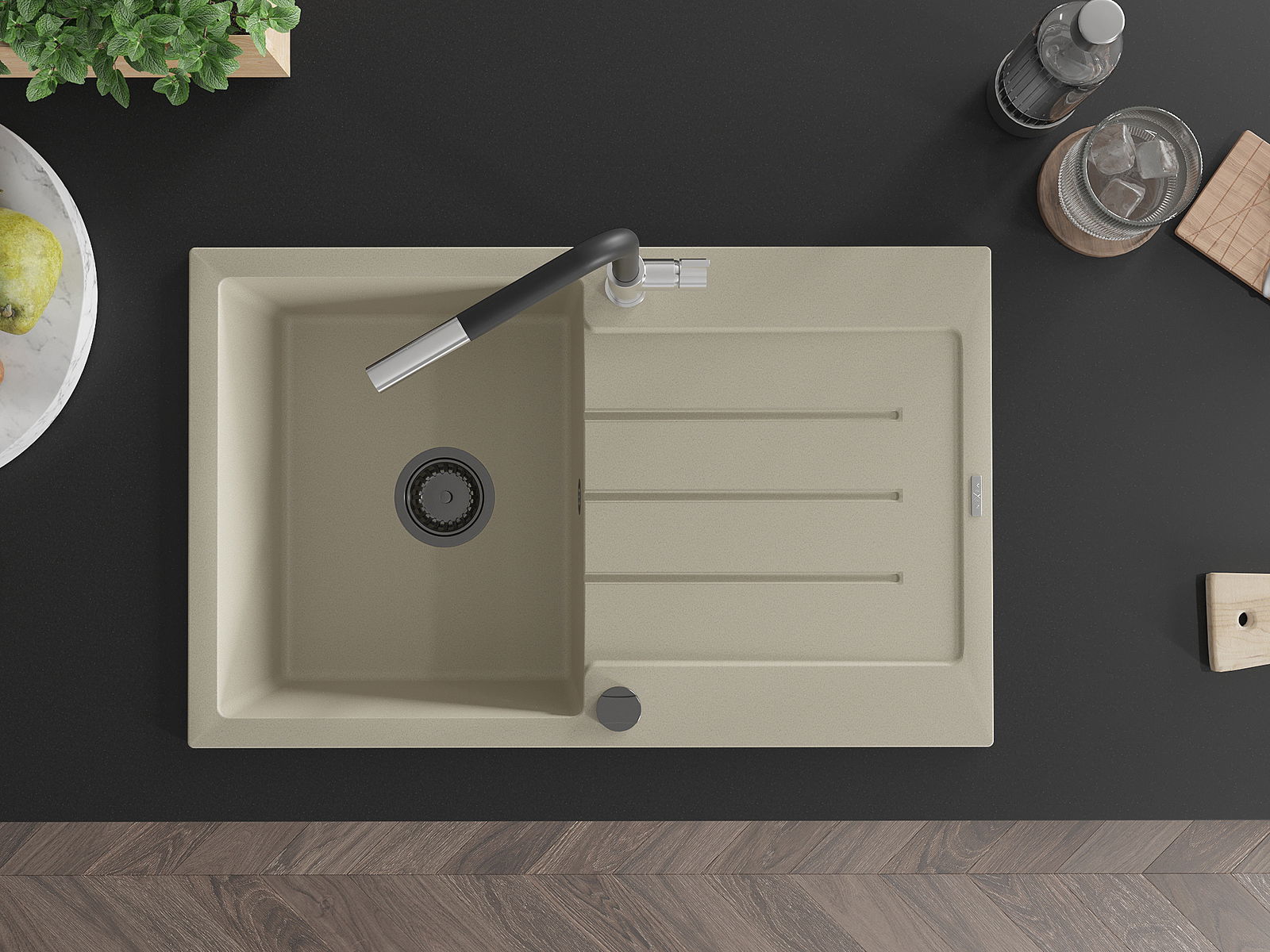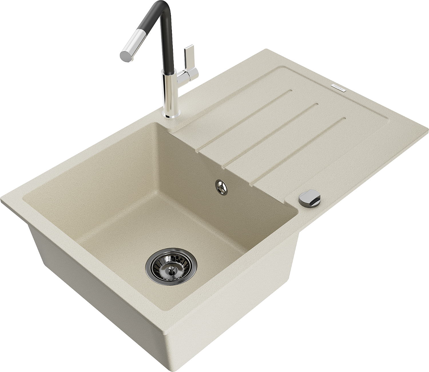 Mexen Bruno granitový dřez 1-komorový s odkapávačem a kuchyňskou baterií Flora, béžový - 6513-69-670401-07-B