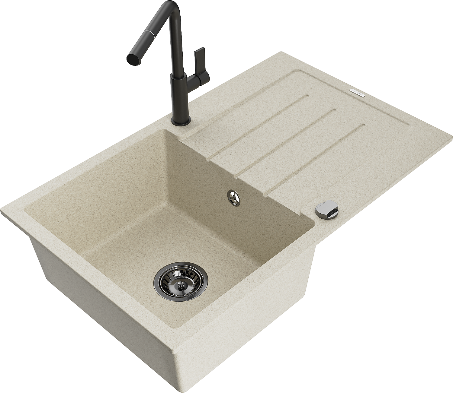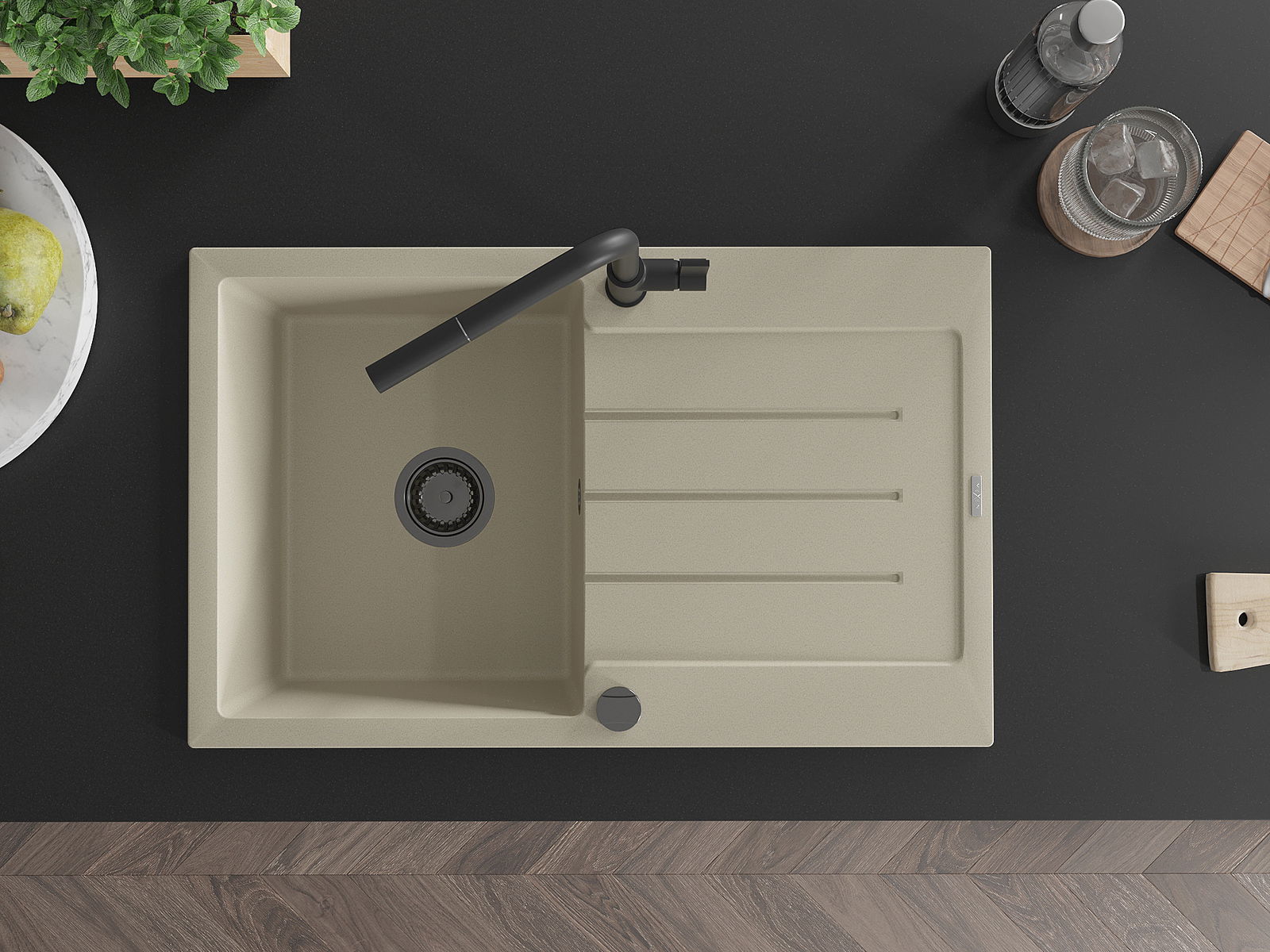 Mexen Bruno granitový dřez 1-komorový s odkapávačem a kuchyňskou baterií Flora, béžový - 6513-69-670401-70-B