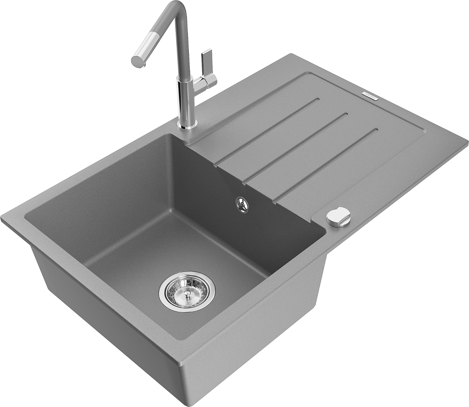 Mexen Bruno granitový dřez s 1 komorou a odkapem a kuchyňskou baterií Flora, šedý - 6513-71-670401-06