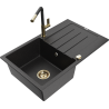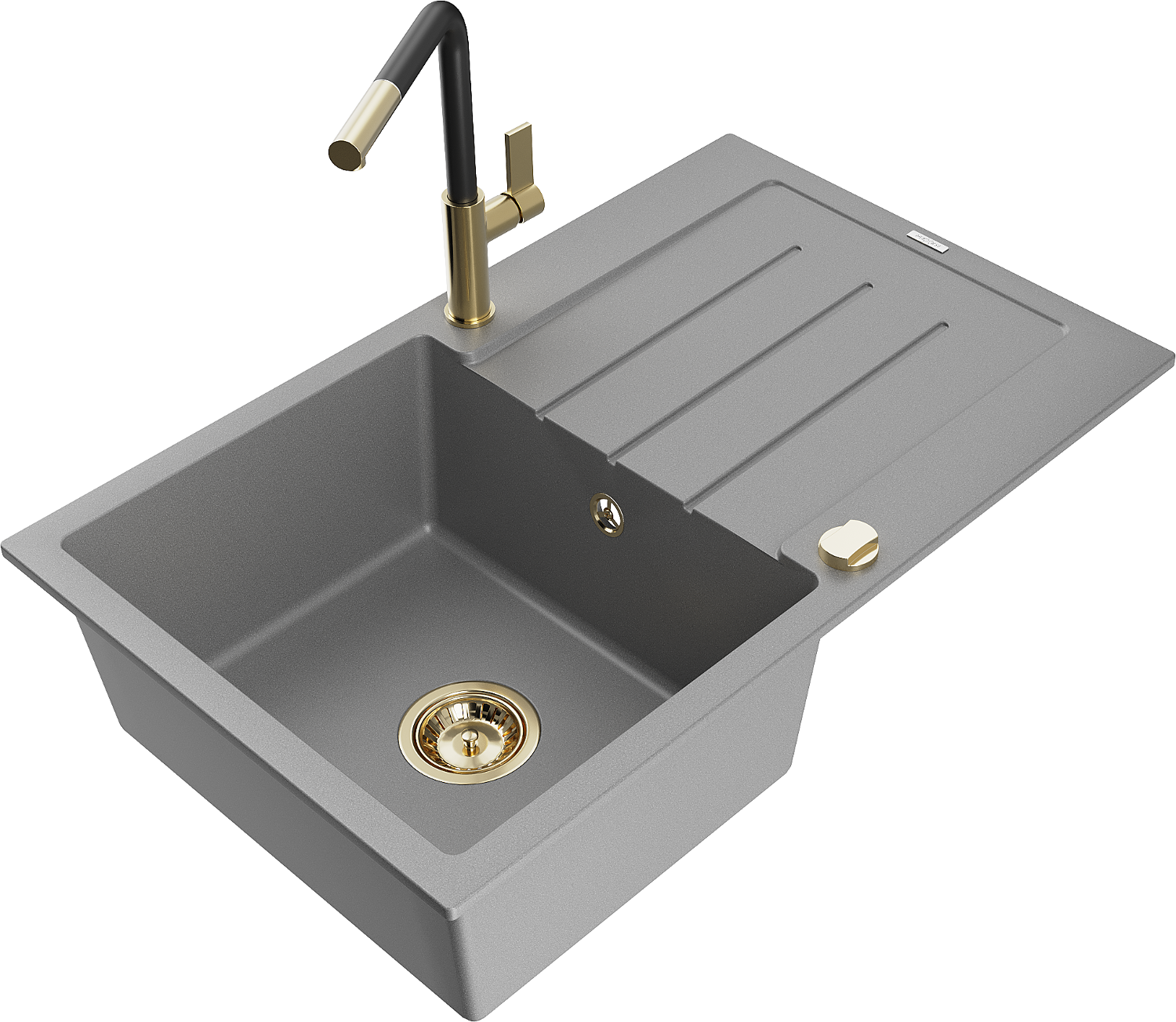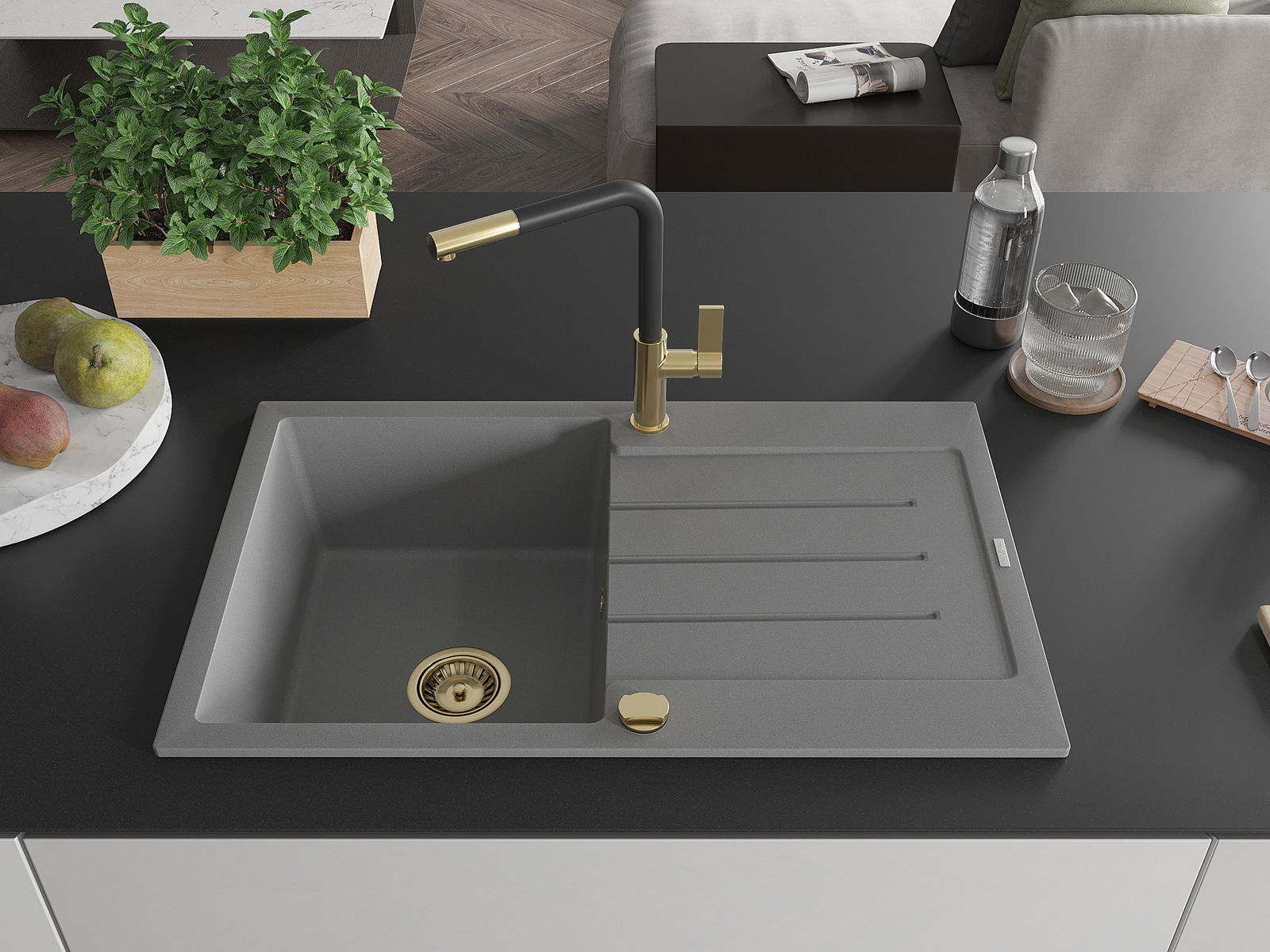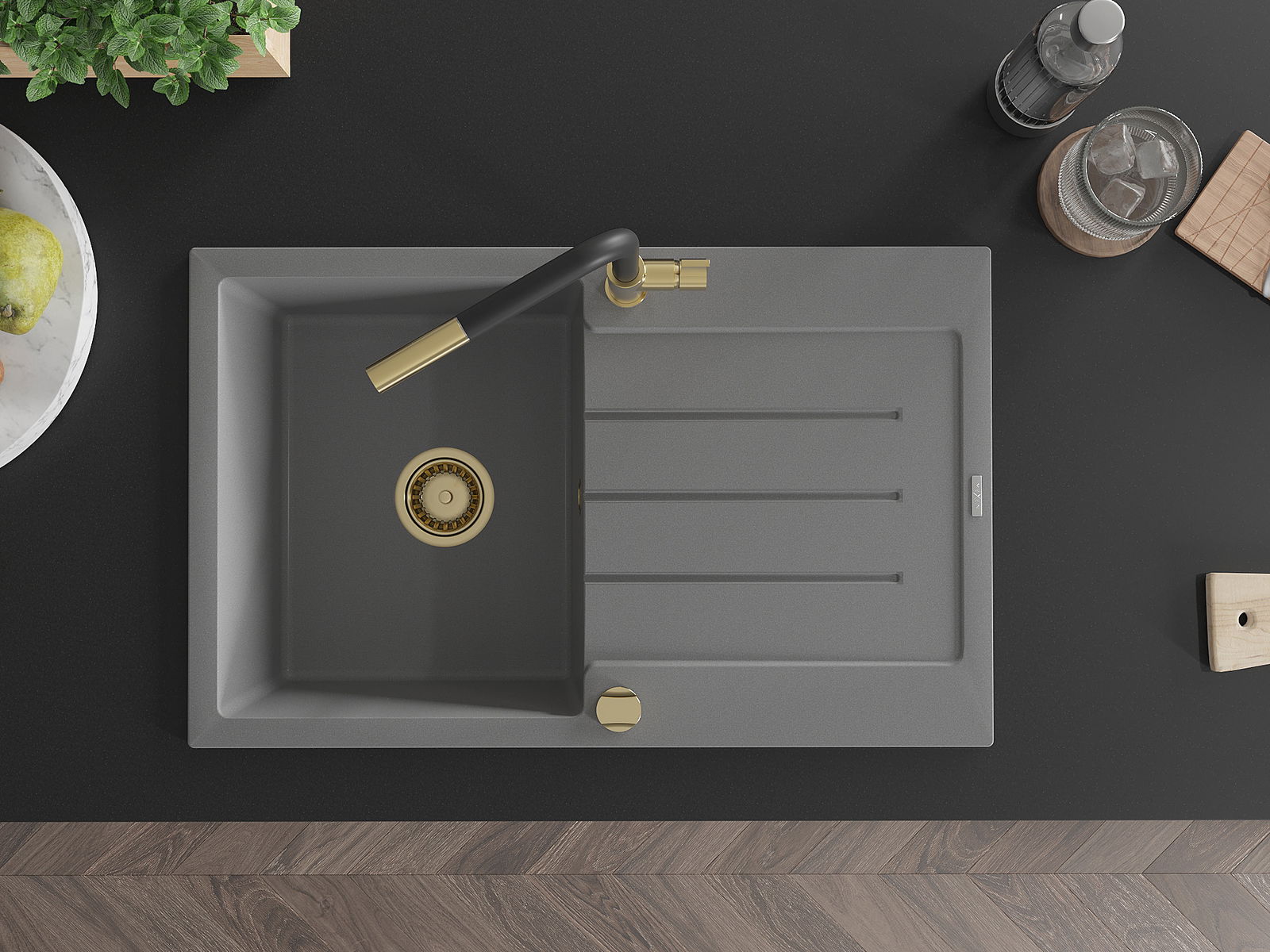 • Mexen Bruno granitový dřez 1-komorový s odkapávačem a kuchyňskou baterií Flora, šedý - 6513-71-670401-57-G