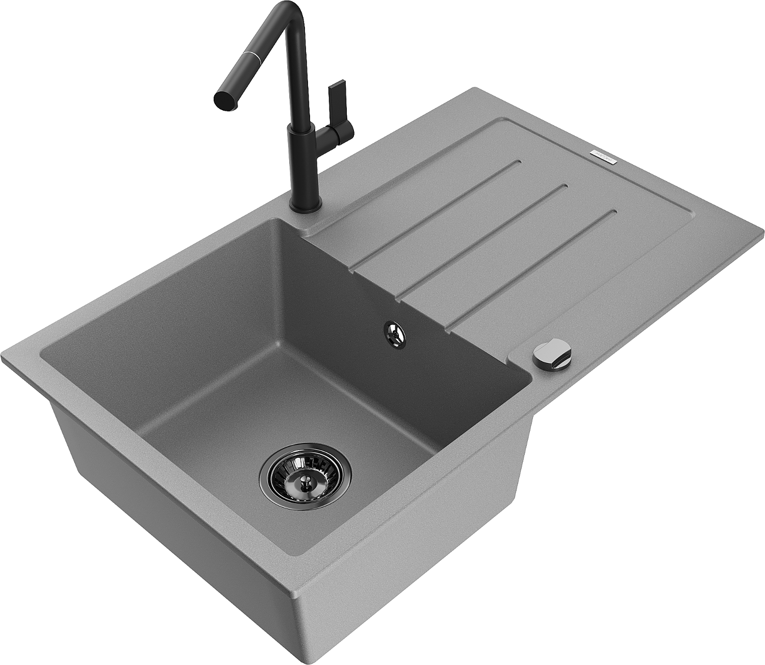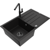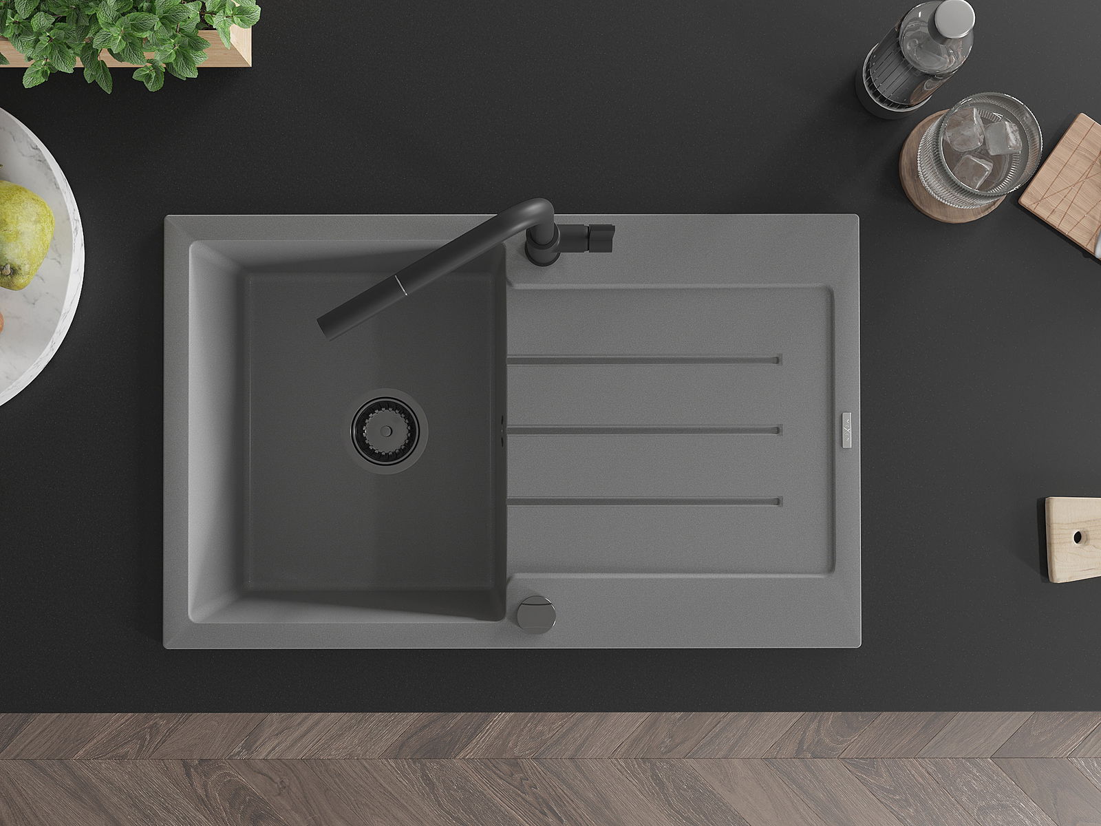 Mexen Bruno granitový jednodřez s odkapávačem a kuchyňskou baterií Flora, šedý - 6513-71-670401-70-B