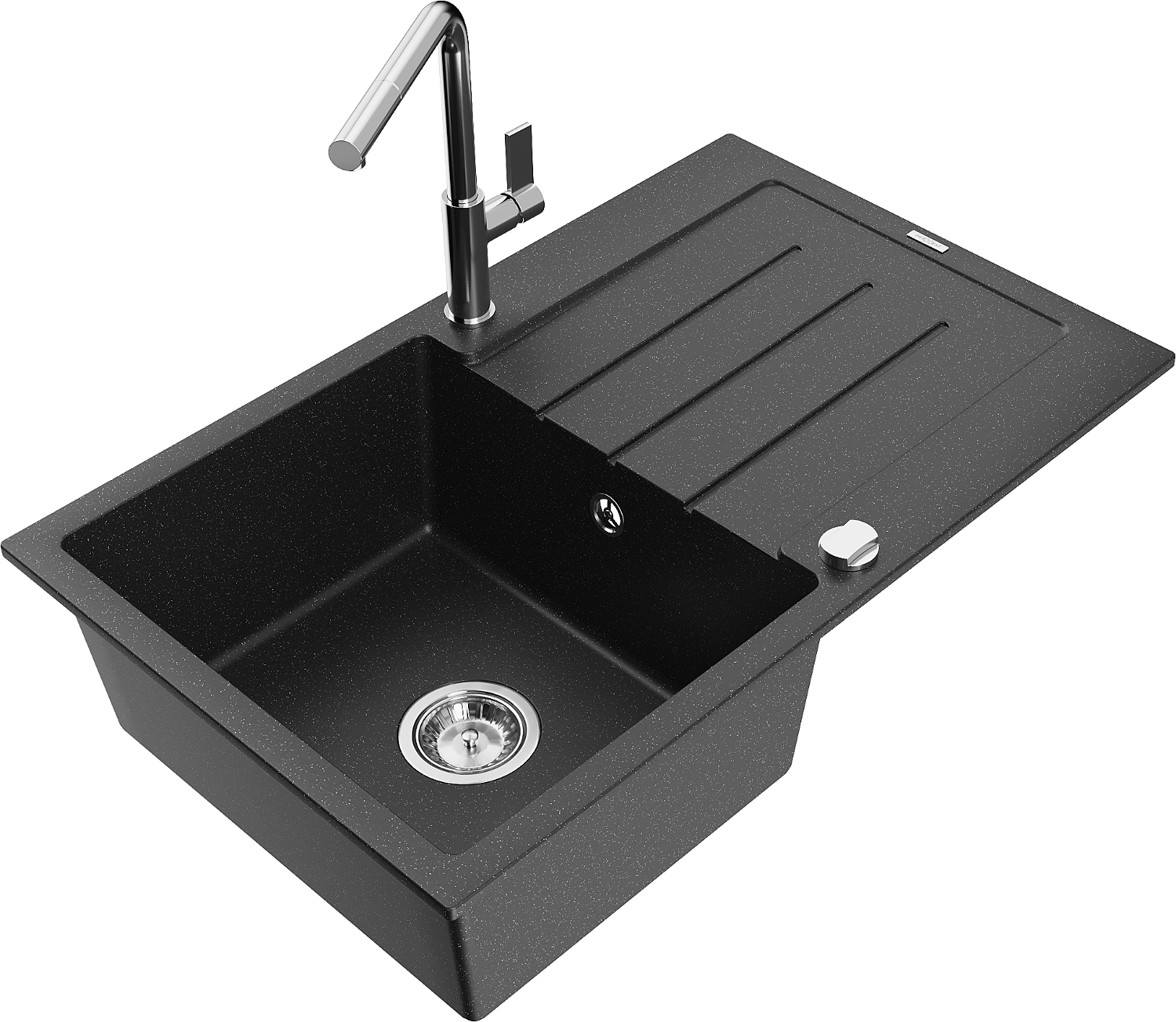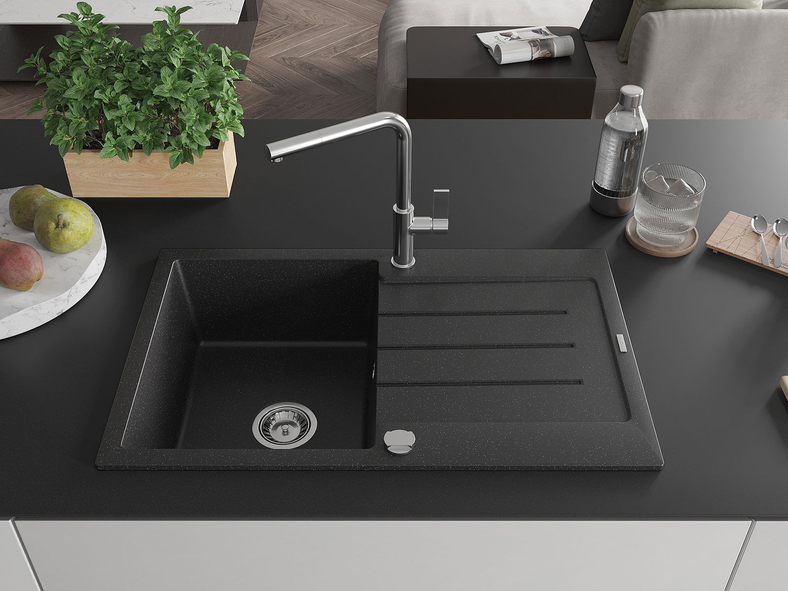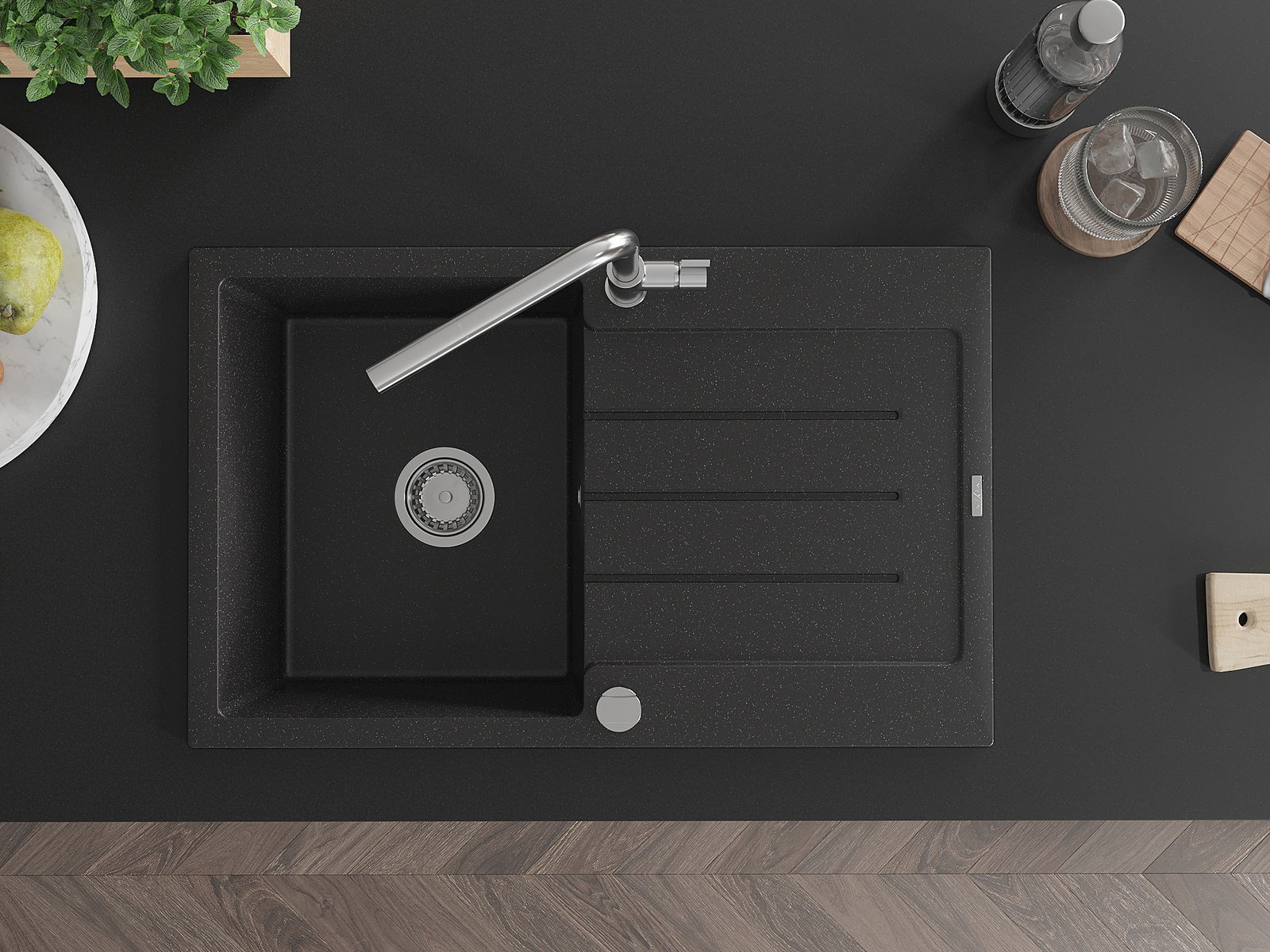 Mexen Bruno granitový dřez 1-komorový s odkapávačem a kuchyňskou baterií Flora, černý/stříbrný metalik - 6513-73-670401-00