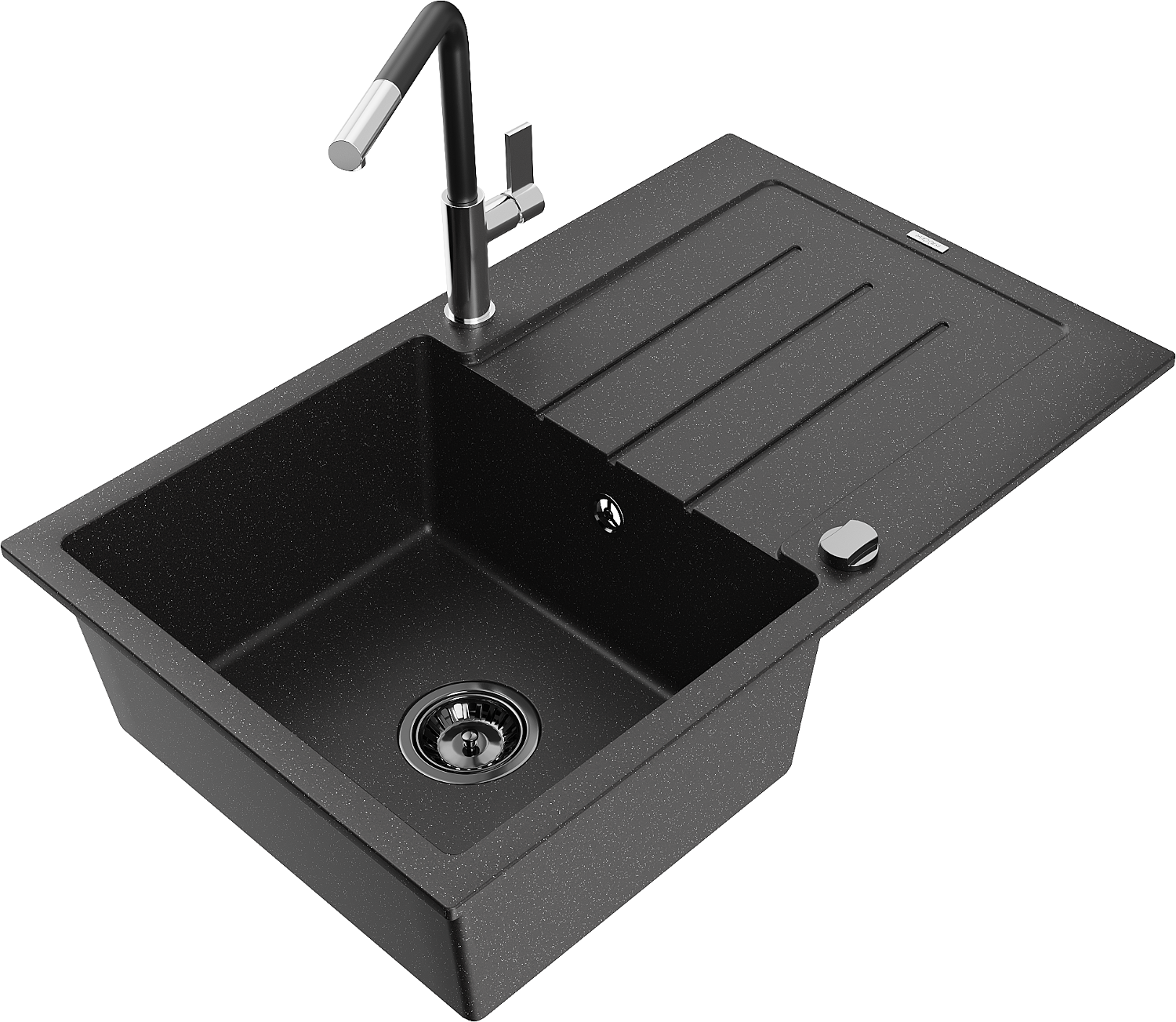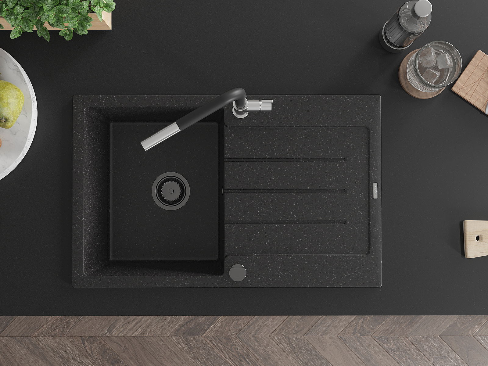 Mexen Bruno granitový dřez s odkapávačem a kuchyňská baterie Flora, černá/stříbrný metalík - 6513-73-670401-07-B