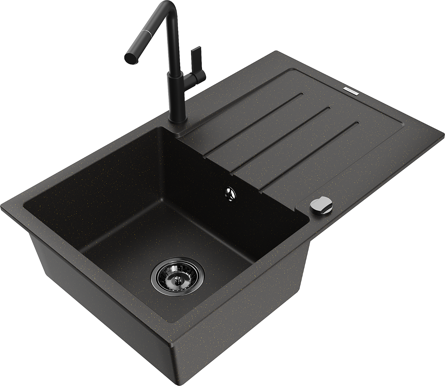 Mexen Bruno granitový dřez 1-komorový s odkapávačem a kuchyňskou baterií Flora, černý/zlatý metalik - 6513-75-670401-70-B
