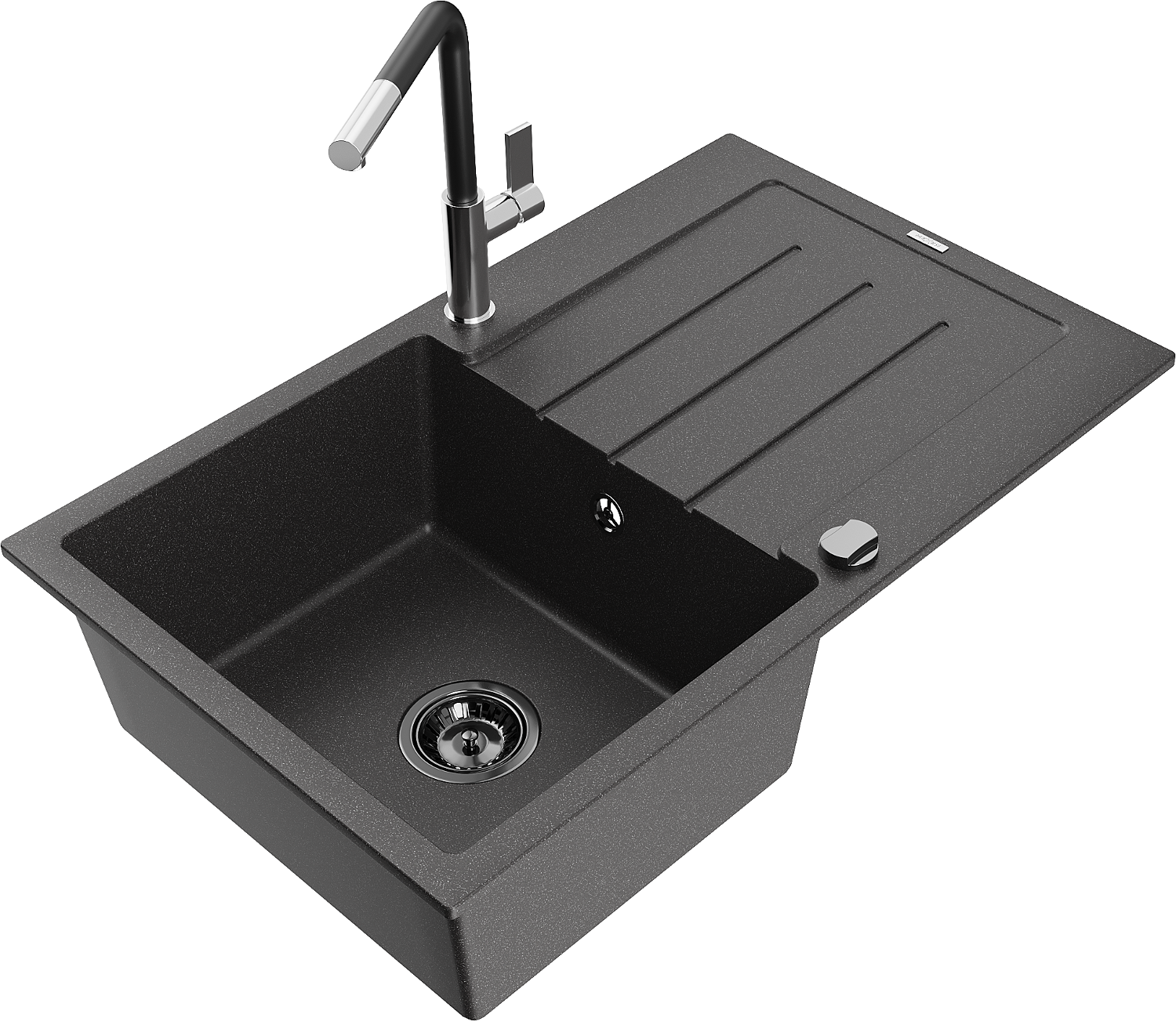 Mexen Bruno granitový dřez s odkapávačem a kuchyňskou baterií Flora, černý tečkovaný - 6513-76-670401-07-B