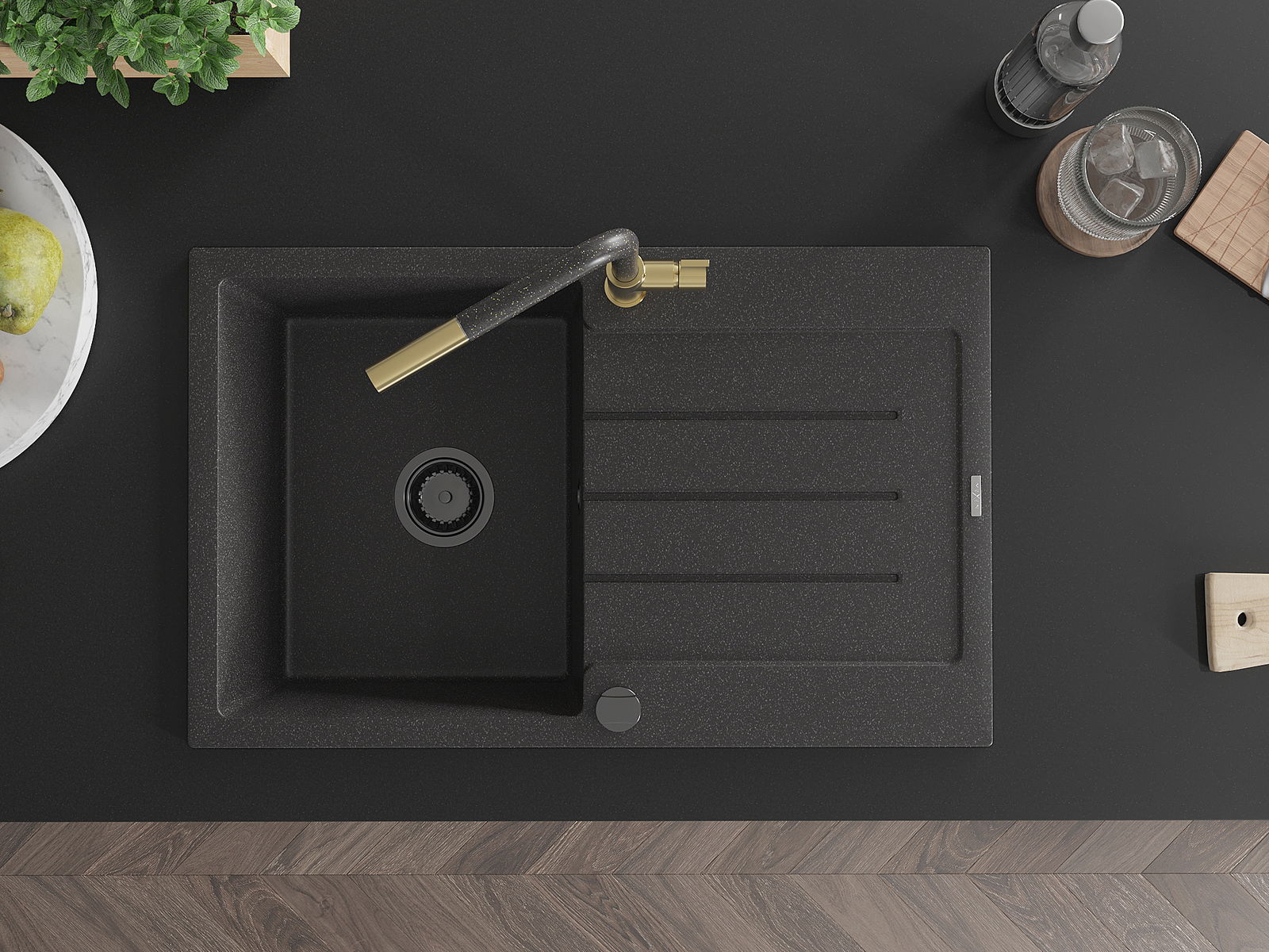 Mexen Bruno granitový dřez s 1 komorou a odkapávačem a kuchyňskou baterií Flora, černý skvrnitý - 6513-76-670401-75-B