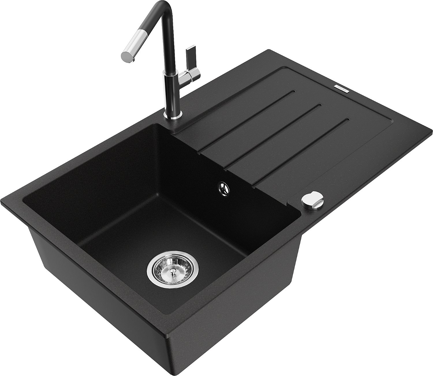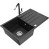 Mexen Bruno granitový dřez 1-komorový s odkapávačem a kuchyňská baterie Flora, černý - 6513-77-670401-07