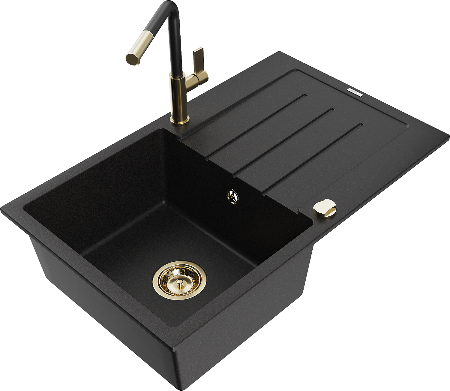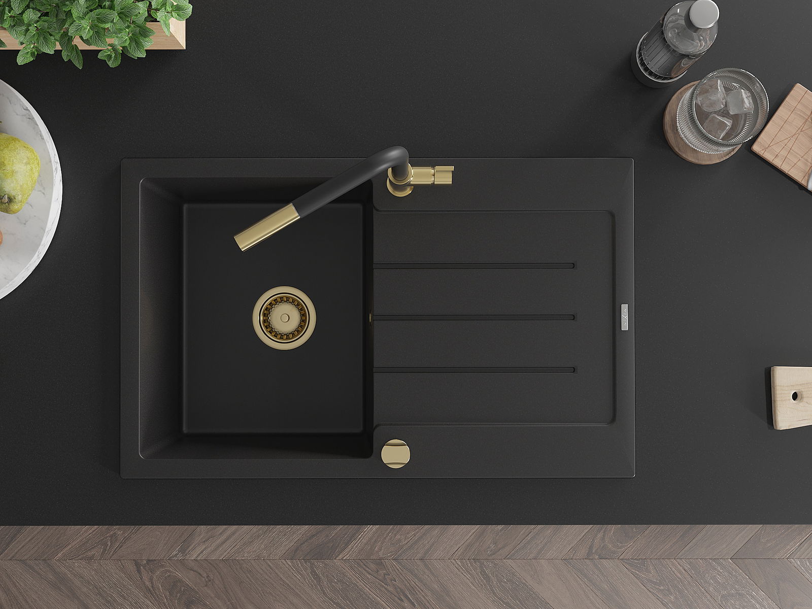 Mexen Bruno granitový dřez 1-komorový s odkapávačem a kuchyňskou baterií Flora, černý - 6513-77-670401-57-G