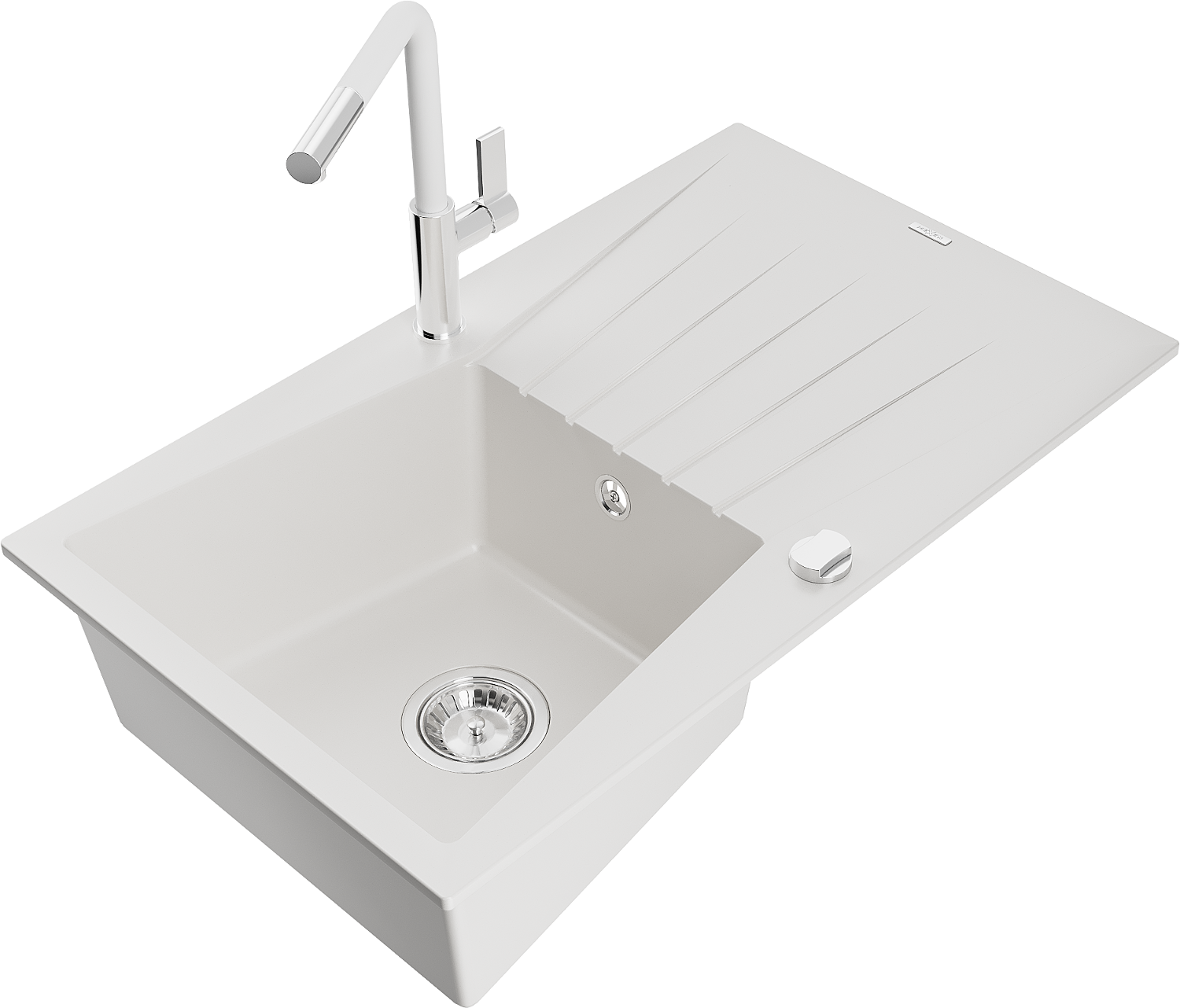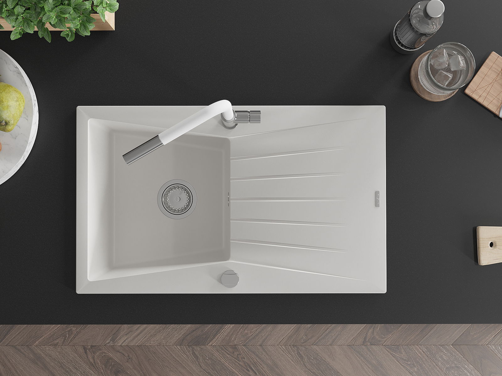 Mexen Cesar granitový dřez 1-komorový s odkapávačem a kuchyňskou baterií Flora, bílý - 6514-20-670401-02
