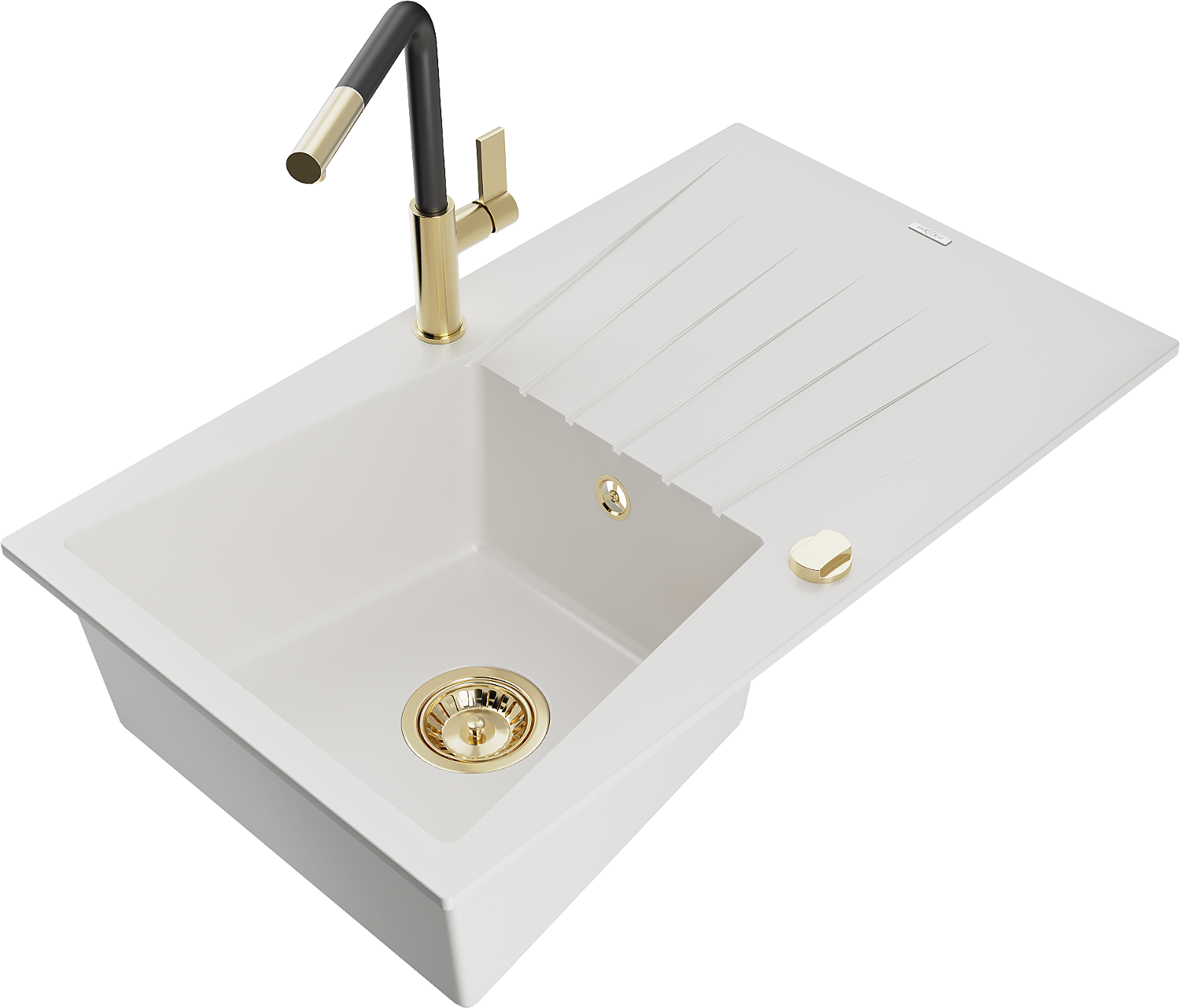 Mexen Cesar granitový kuchyňský dřez 1-komorový s odkapávačem a kuchyňskou baterií Flora, bílý - 6514-20-670401-57-G
