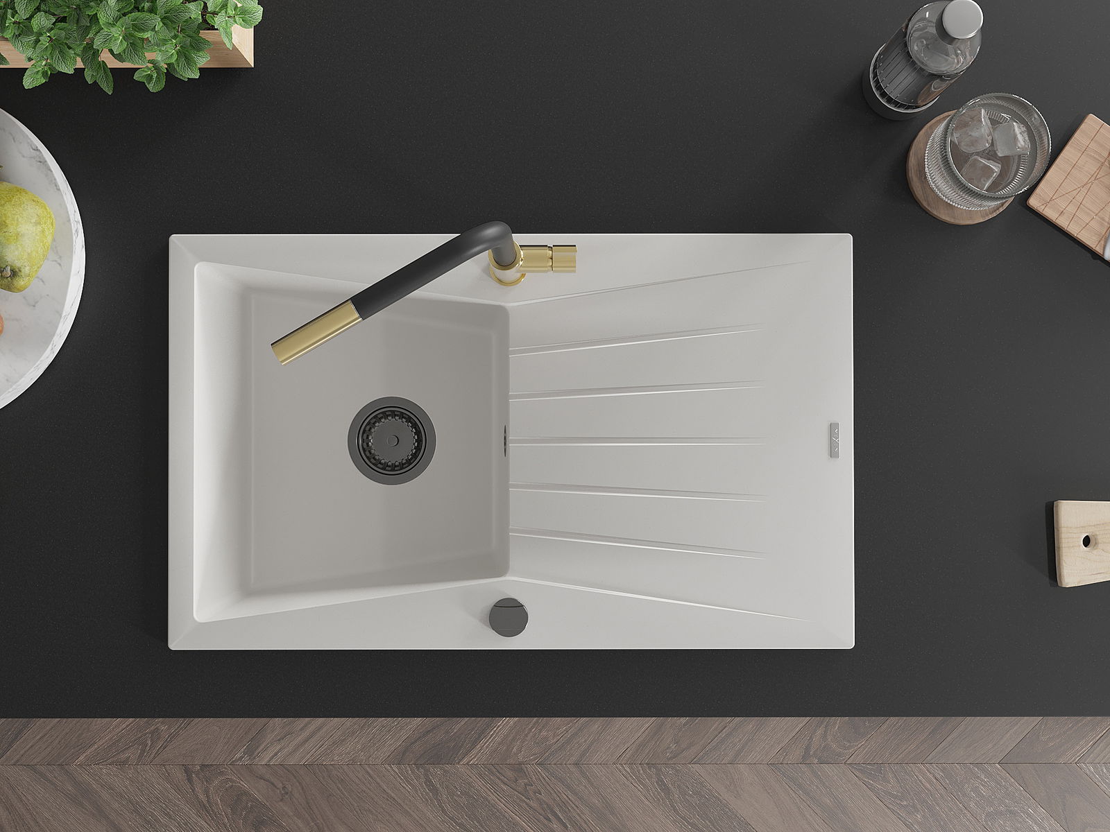 Mexen Cesar granitový dřez 1-komorový s odkapávačem a kuchyňskou baterií Flora, bílý - 6514-20-670401-57-B
