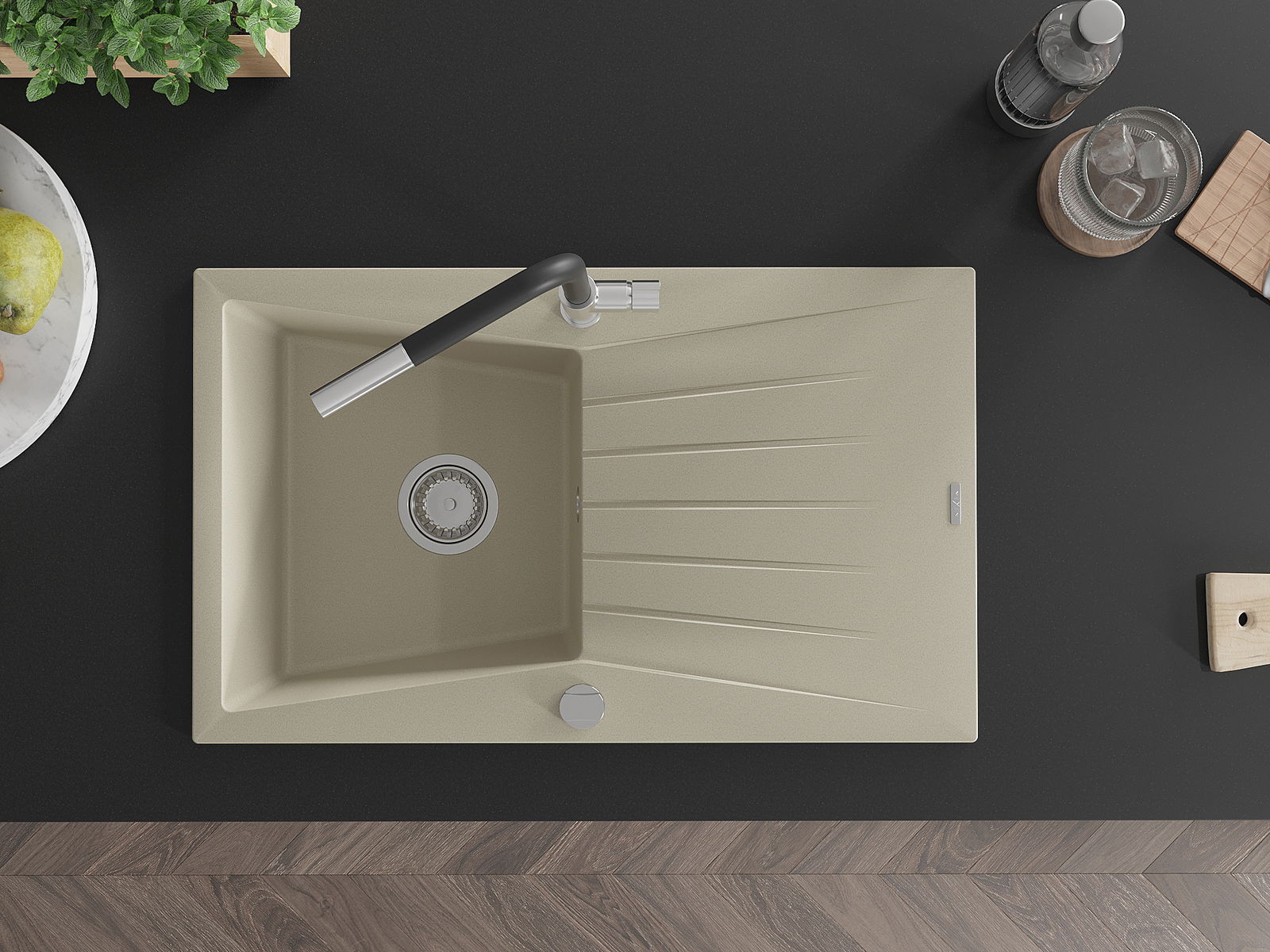 Mexen Cesar granitový dřez s 1 komorou a odkapávací plochou a kuchyňskou baterií Flora, béžový - 6514-69-670401-07